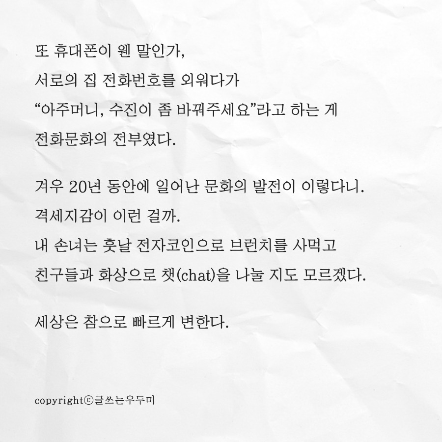 겨우 20년 동안에 일어난 문화의 발전이 이렇다니. 격세지감이 이런 걸까. 내 손녀는 훗날 전자코인으로 브런치를 사먹고 친구들과 화상 챗(chat)을 나눌 지도 모르겠다. 세상은 참으로 빠르게 변한다.