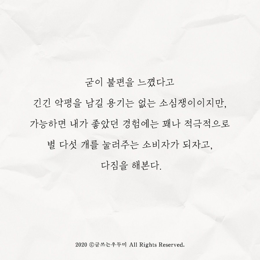 굳이 불편을 느꼈다고 긴긴 악평을 남길 용기는 없는 소심쟁이이지만, 가능하면 내가 좋았던 경험에는 꽤나 적극적으로 별 다섯 개를 눌러주는 소비자가 되자고, 다짐을 해본다. 무미건조한 이 세상에 이렇게라도 한 스푼의 기름기를 발라주는 존재가 되고싶다.