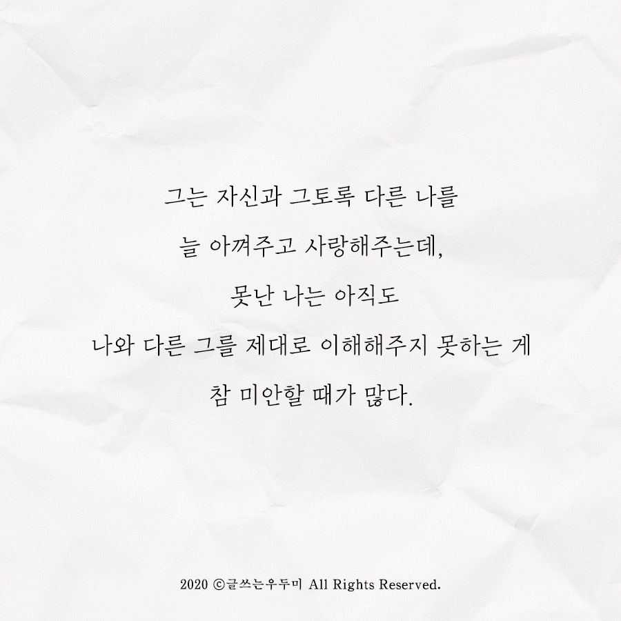 물론 나는 아직도 여전히, 시간이 없고 알고 싶은 건 많은 욕심쟁이다. 내가 원하는 모습을 이룩하기 위해서 배워야 할 것들도 경험해야 할 것들도 무지무지 많아서 단 일분도 허투루 쓰기 싫어하는, 성공 지향적이고 포부가 큰 내게는 취해 마땅한 자세일지도 모른다. 하지만 내가 사랑하는 내 남편은 아니다. 그는 현실에 만족하면서 소박하고 평화롭게 살아가는 사람이니까. 그는 자신과 그토록 다른 나를 늘 아껴주고 사랑해주는데, 못난 나는 아직도 나와 다른 그를 제대로 이해해주지 못하는 게 참 미안할 때가 많다. 반성하고, 또 반성한다.