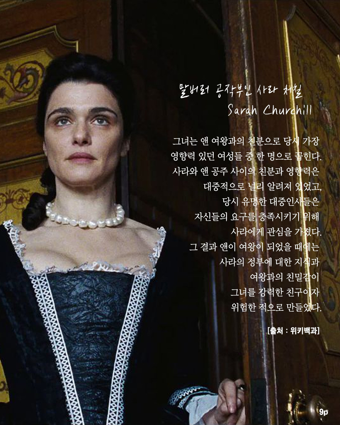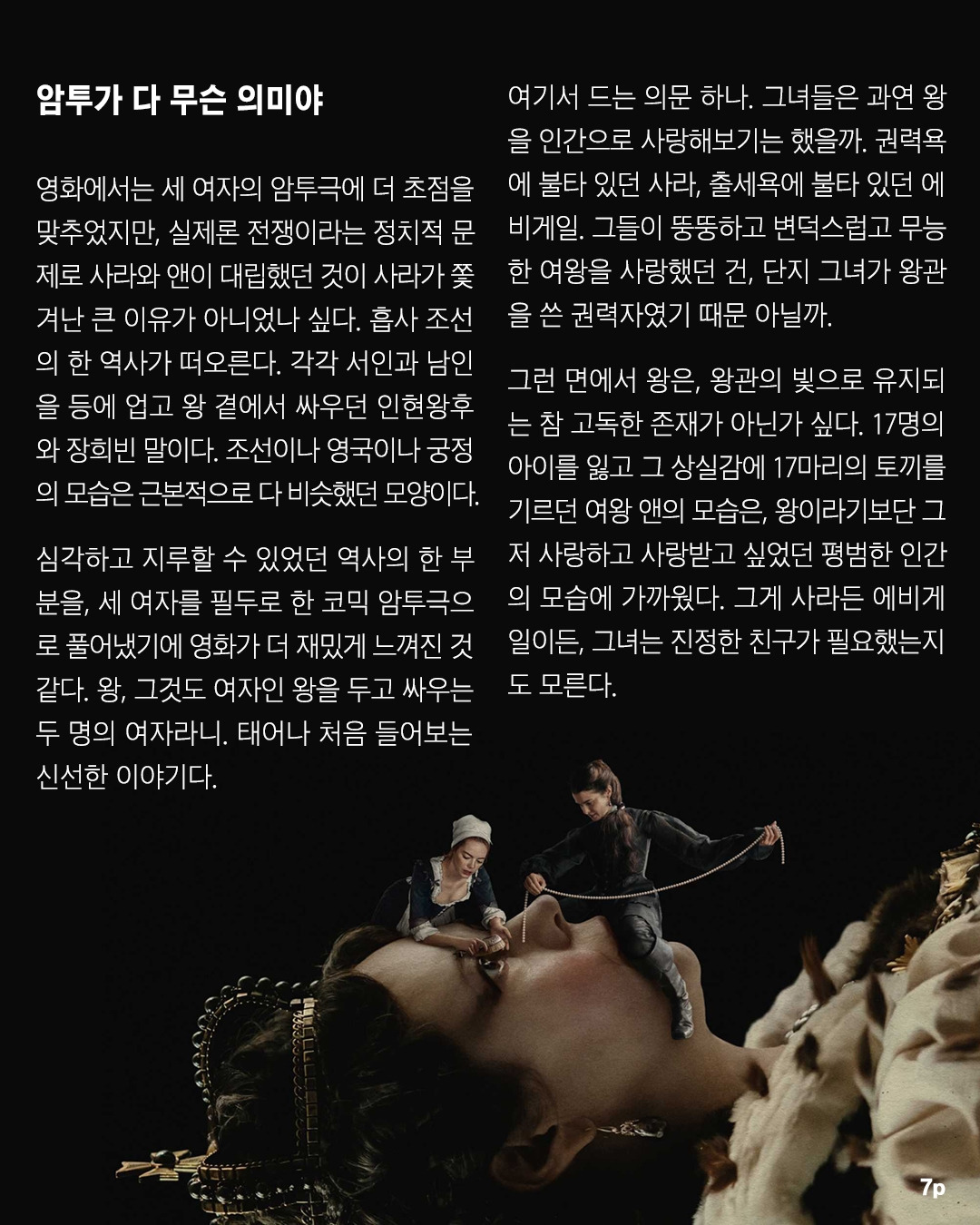 영화가 끝난 뒤 나는 잠시 생각해보았다. 내가 에비게일이었다면 어땠을까 하고. 내게도 일말의 출세욕 같은 게 모락모락 피어나, 나를 구제해준 친척 언니 사라를 제치고 왕의 사랑을 받고자 애썼을까. 음, 아닐 것 같다. 소심한 나는 일단 나를 구제해준 사라 언니를 위해 열심히 일했을 것이다. 공작부인인 사라 옆에만 잘 있었어도 남은 내 여생은 그럭저럭 괜찮았을 테니까. 내가 사라였다면 또 어땠을까. 나는 치정 싸움 그 멀리까지는 가지도 않고, 그저 앤 여왕의 말벗 정도로만 만족하며 살았을 것 같다. 여왕의 친구로만 있었어도 분명 편안히 살 수 있었을 테니까. 괜한 권력 욕심의 끝은 언제나 비극인 법, 절레절레 사양이다. 역사시간에 아무리 졸았어도 내 그쯤은 안다.