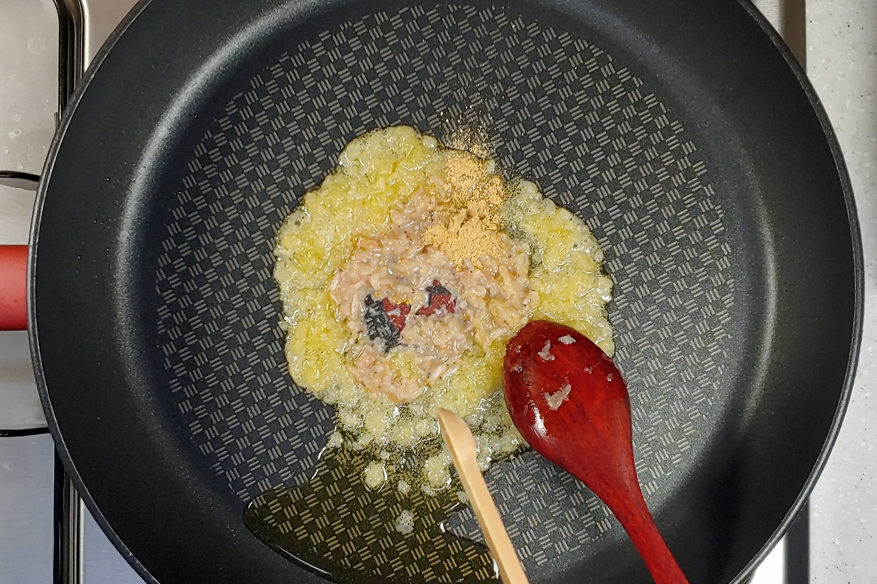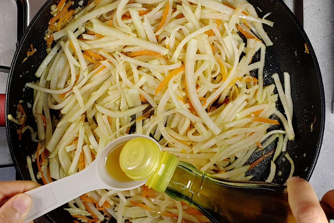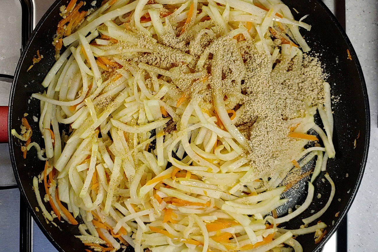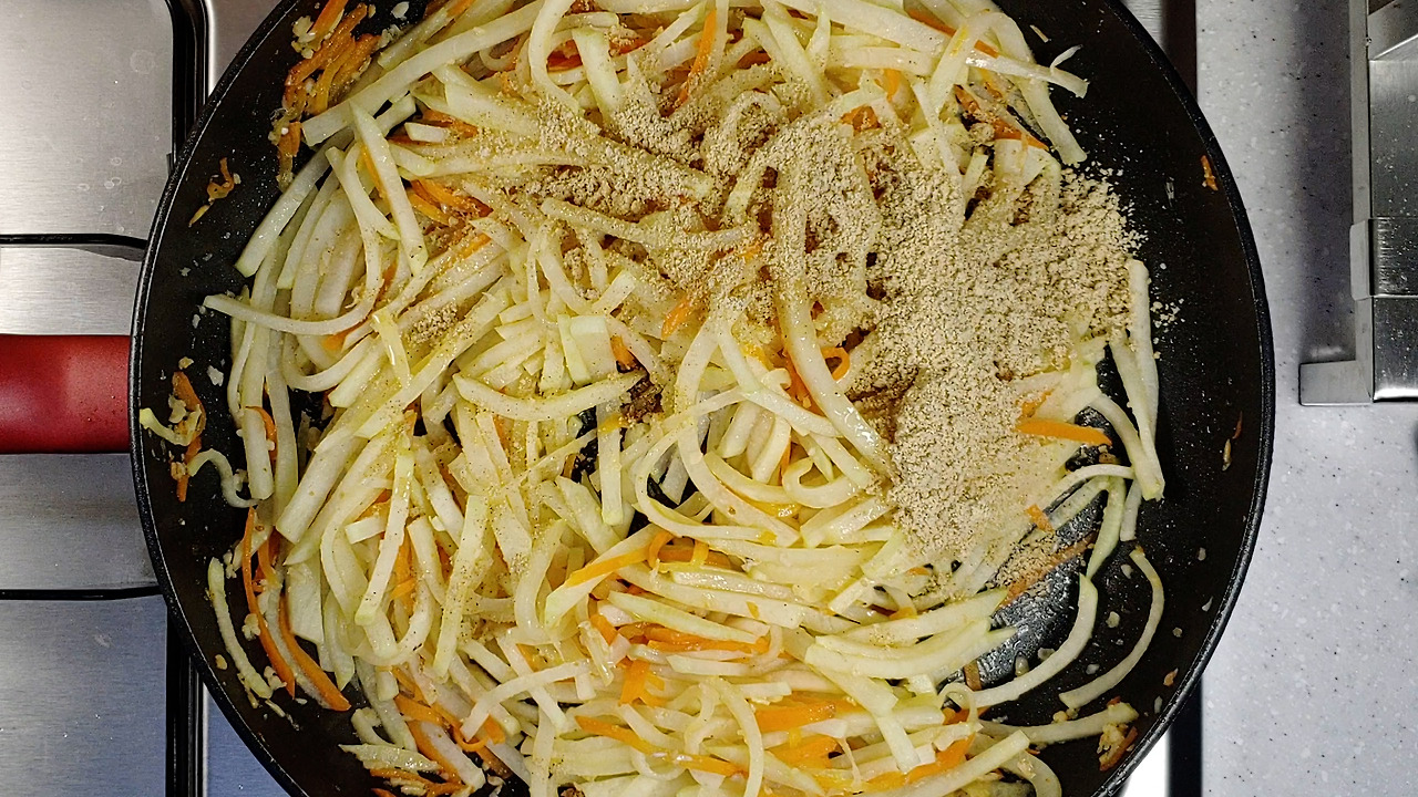 생강가루를 넣고 같이 볶아주세요. 이렇게 하면 새우젓의 비린내와 잡내는 사라지고, 무나물에 간도 골고루 배게 됩니다. 생강은 원래 무와도 궁합이 잘 맞아서 조금씩 넣어주면 좋아요.