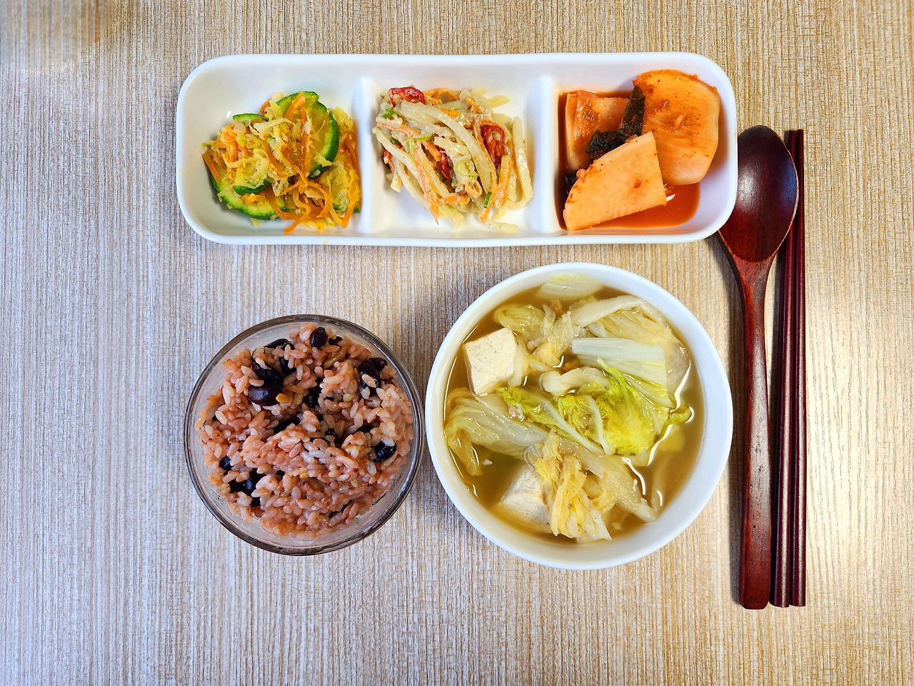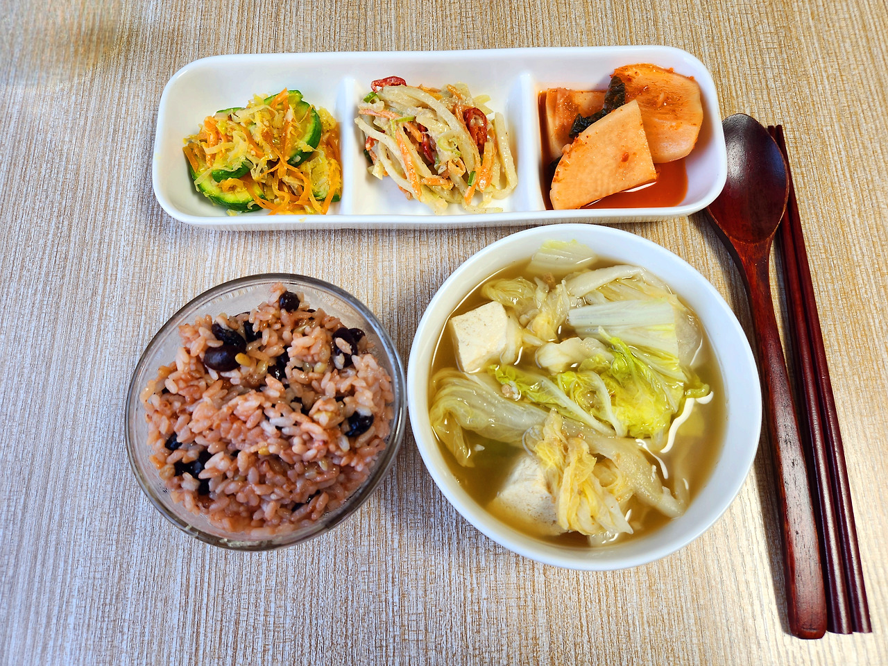 팥밥, 두부배추된장국, 애호박볶음, 무나물, 순무김치입니다.