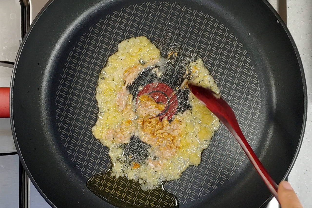 들기름을 두르고 간마늘을 볶다가 새우젓을 넣어 같이 볶아주세요. 저는 들기름 넣을 땐 절대 쎈불은 쓰지 않아요. 약불이나 중약불에서 고소한 냄새가 날 때까지 볶습니다.