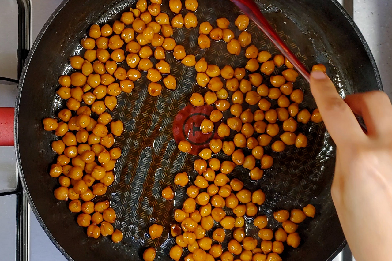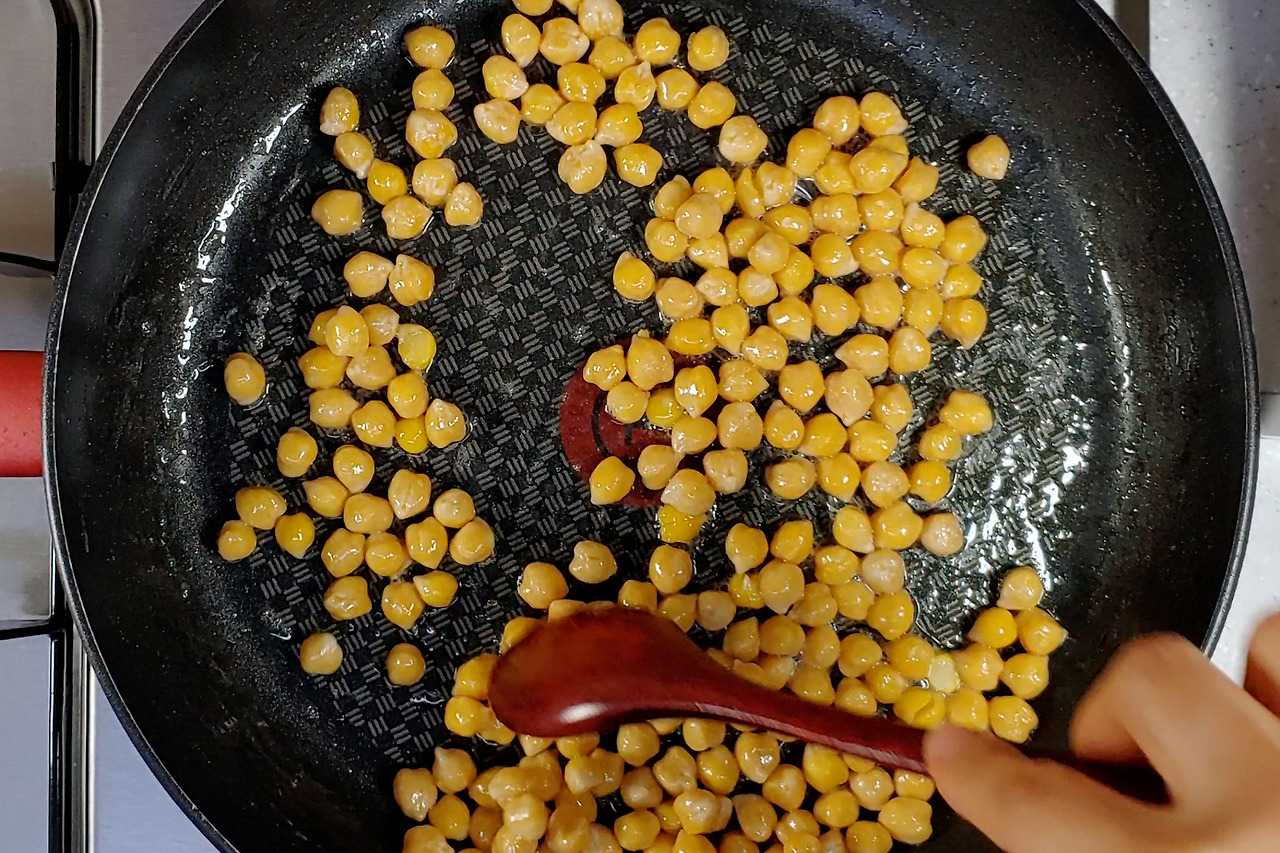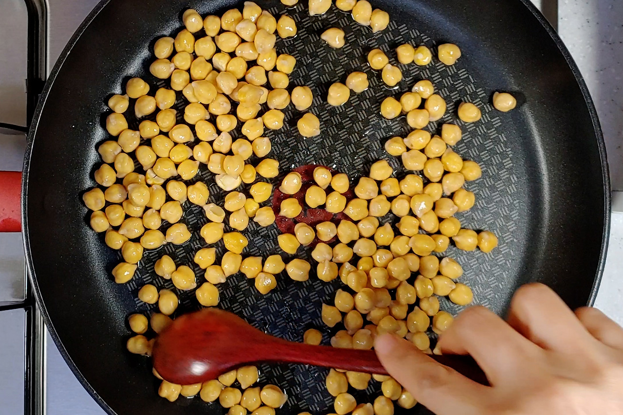 병아리콩이 충분히 불면 물기를 빼주세요. 약불에서 프라이팬에 들기름을 두른 다음 콩을 볶아주세요.