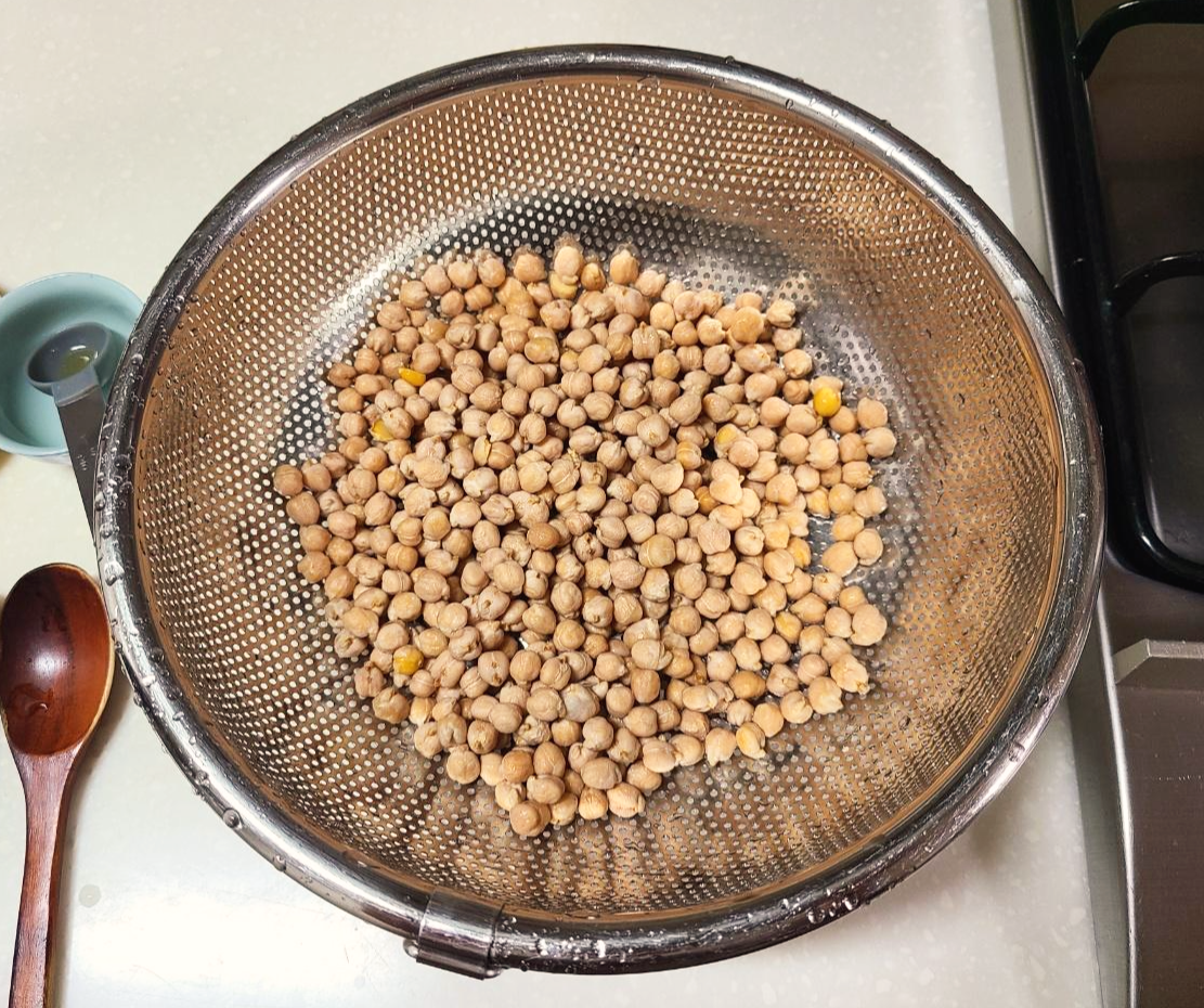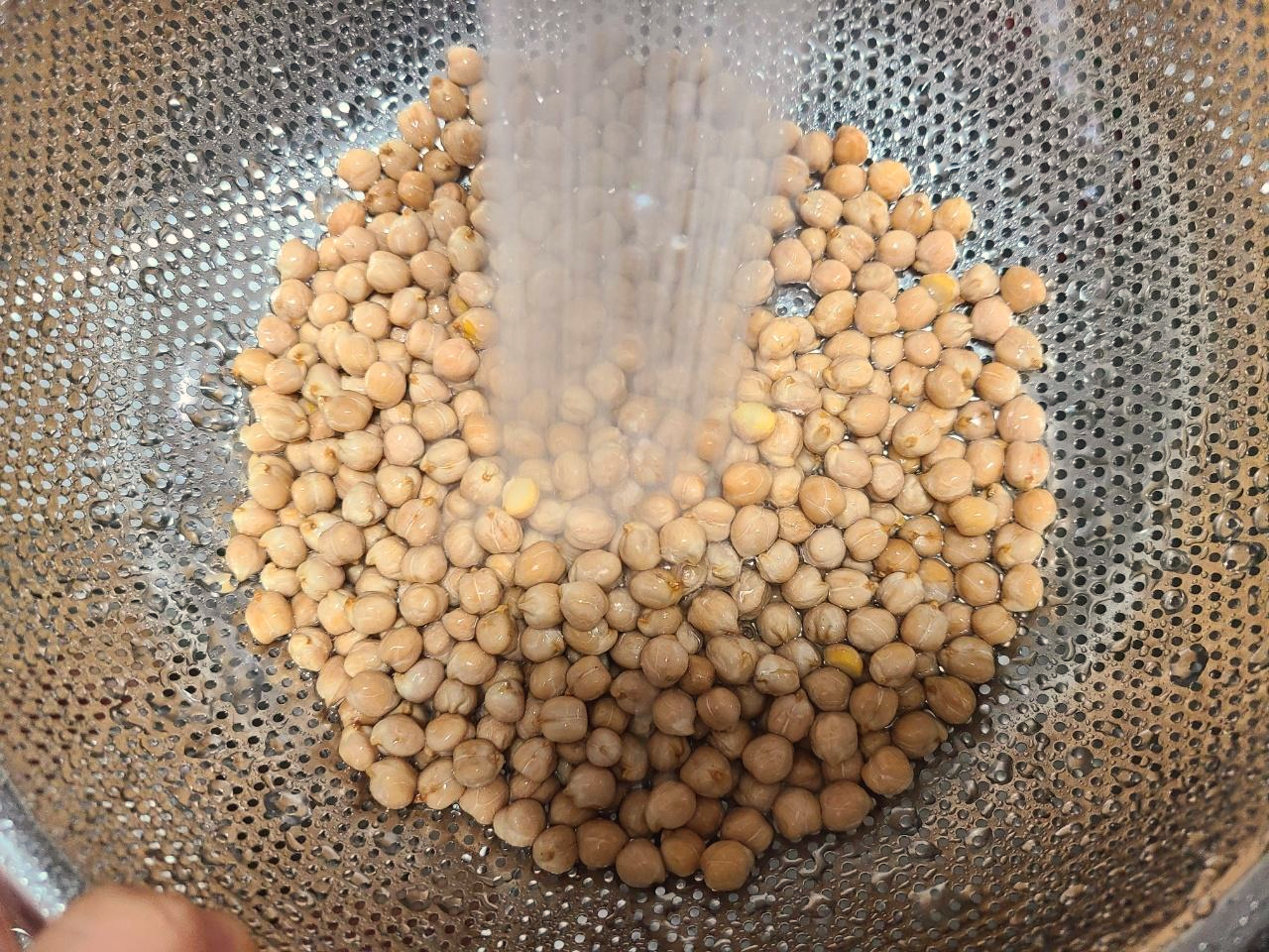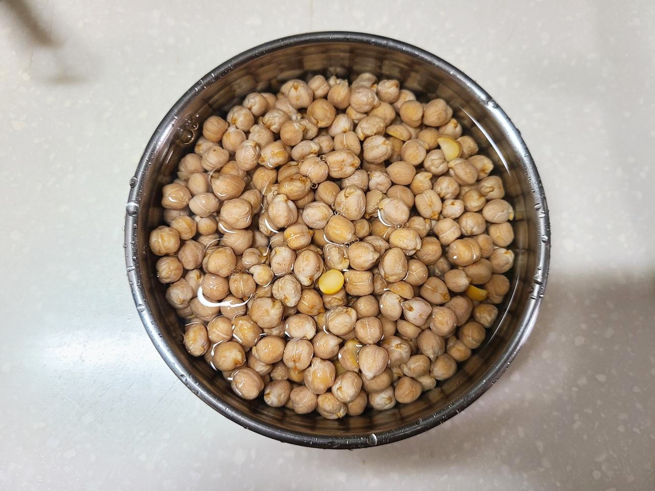 병아리콩은 흐르는 찬물에 가볍에 한번 헹궈주세요. 찬물에 담가서 냉장실에서 1~2일 동안 불려줍니다. 이러면 비린내도 적고 부드럽게 먹을 수 있어요.