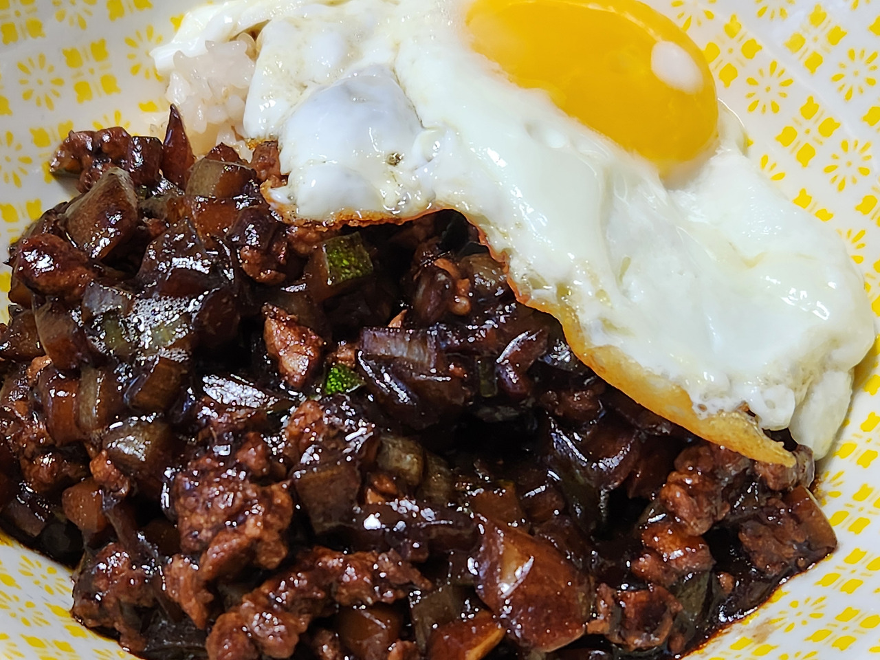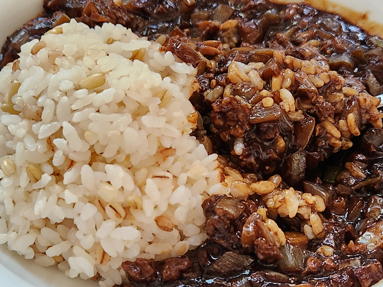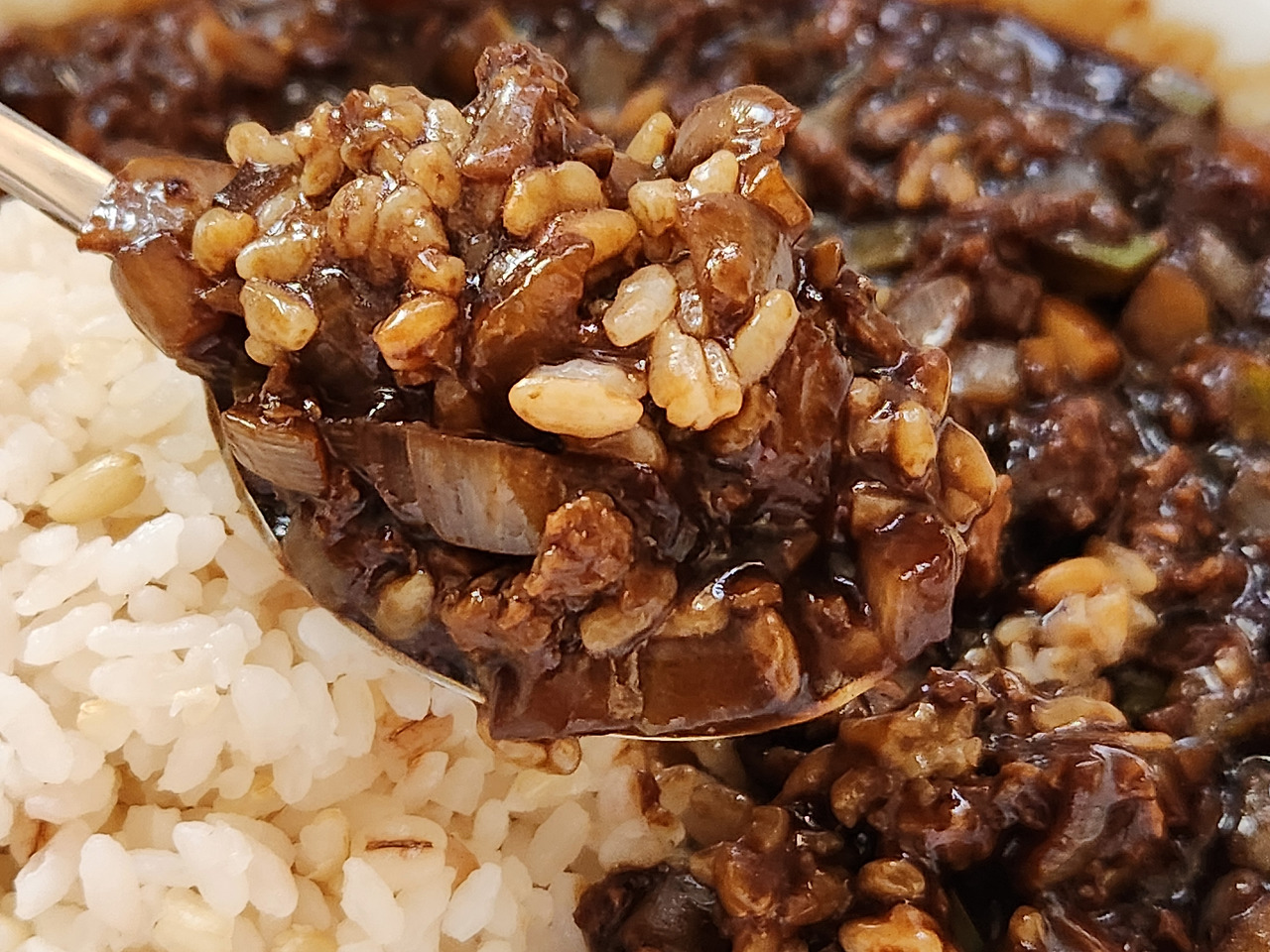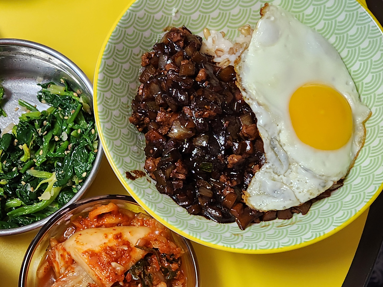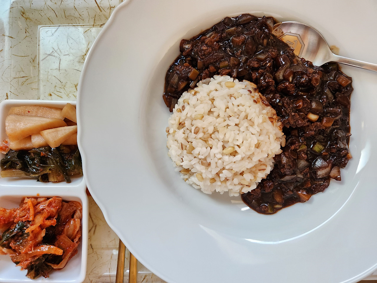 그래서 탄생한 남편의 비건 유니짜장. 원래는 중화면을 넣어야 하는데 되는대로 집에 있던 밥 위에 뿌려먹었다.