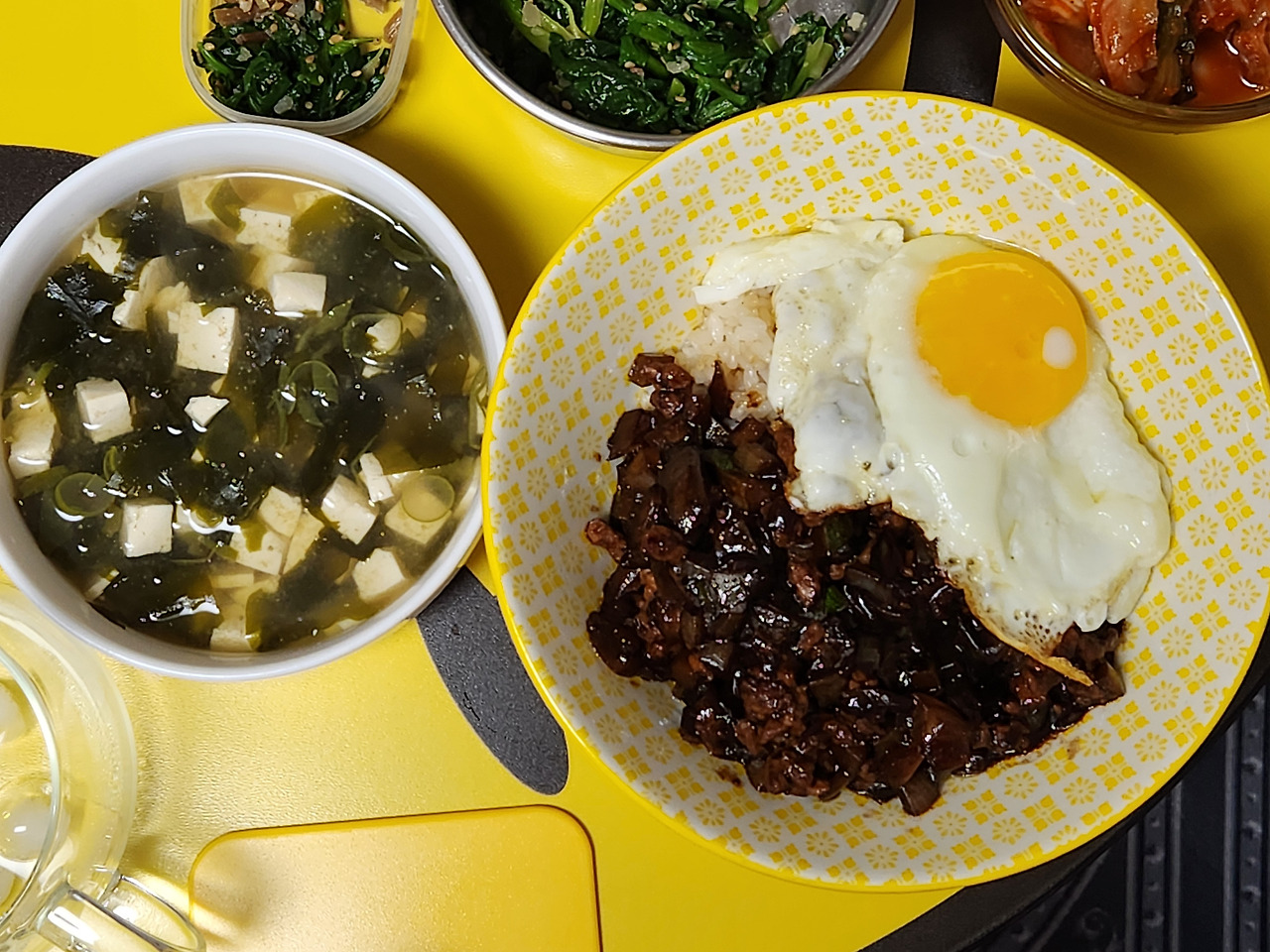 남편이 처음으로 만든 유니짜장엔 내가 만든 된장국을 곁들였다. 일식조리기능사에 나오는 메뉴. 일본식 된장인 미소에 미역은 의외로 잘 어울린다. 두부도 넣고 쪽파도 넣는다. 쪽파가 비쌀 땐 대신 대파를 넣는다. 마지막에 산초가루를 뿌려 마무리하면 비린내는 하나도 없다. 거의 미역국 같은 된장국. 미역국은 남편이 제일 싫어하는 메뉴다.