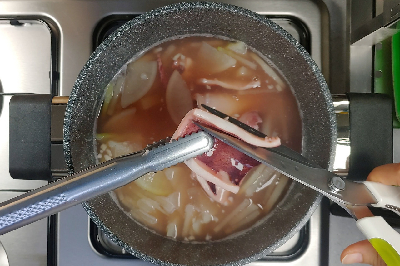오징어뭇국은 오래 끓이면 오징어가 질겨지기 때문에 후루룩 약중불에서 끓여내야해요. 그래서 짧은 시간 내에 익을 수 있도록 평소보다 조금 얇팍하게 나박썰기를 해야합니다.
