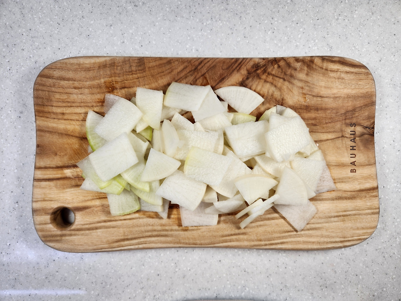 저는 물김치 용으로 나박나박하게 살짝 비치게 썰었어요.