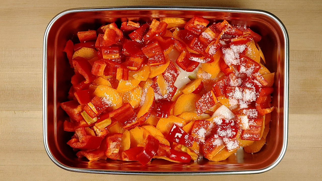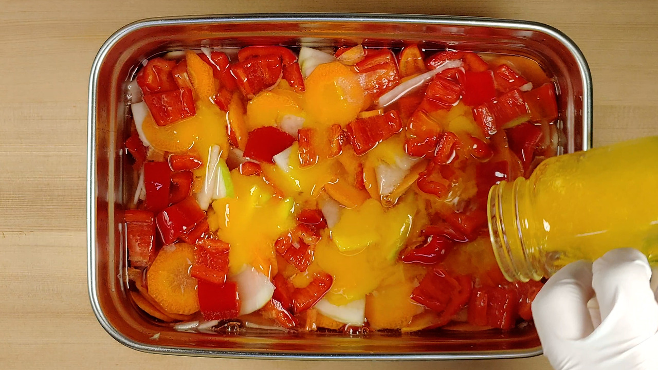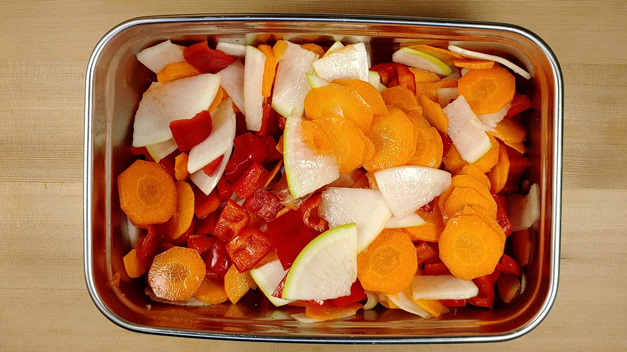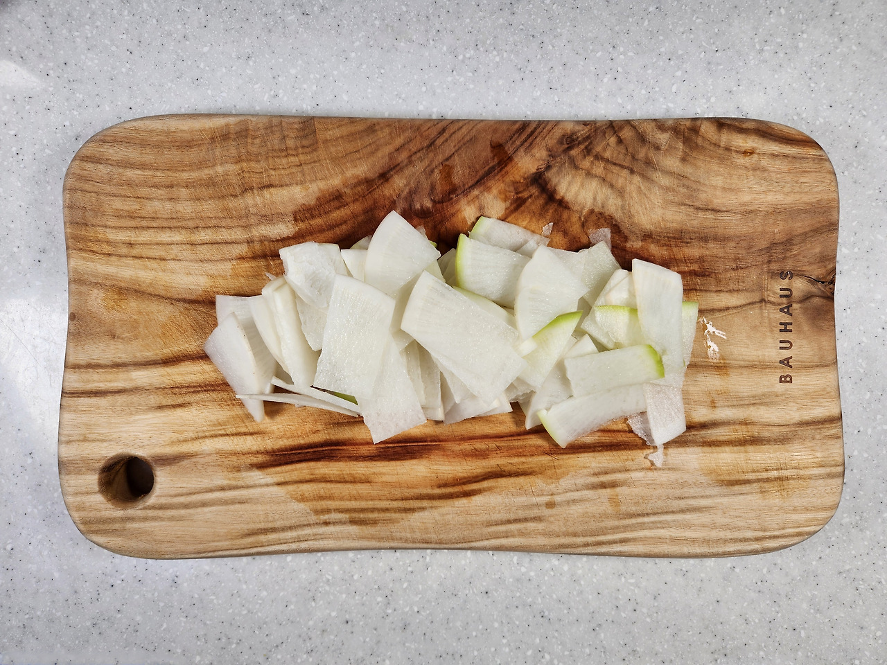 무와 당근은 얇게 나박썰고, 미니파프리카는 반으로 갈라 씨를 제거한 뒤 먹기좋게 썰어주세요.