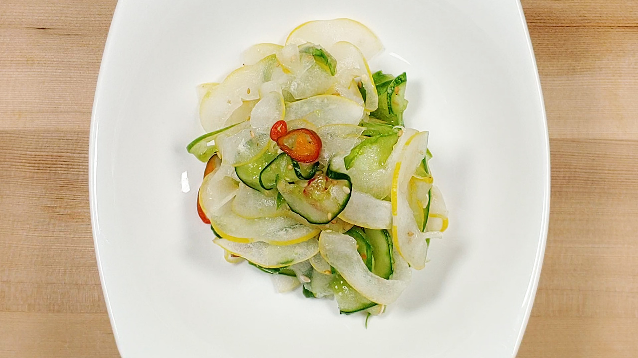 참외는 베이킹소다에 담궜다가 식촛물로 깨끗이 씻어주세요. 씨와 속을 제거한 뒤 껍질째 얇게 썰어줍니다.