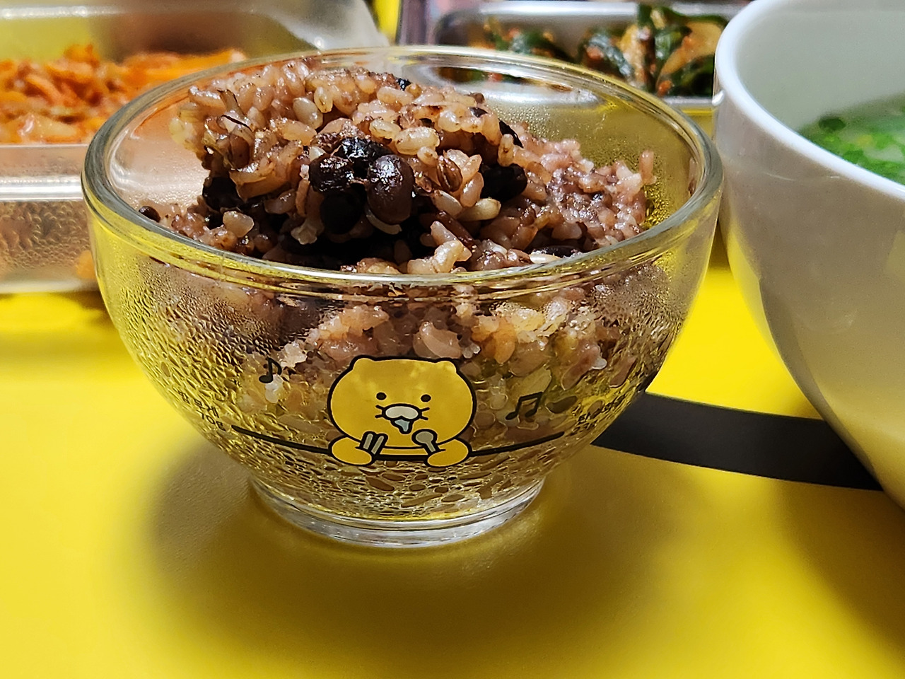 밥을 적게 먹기 위해 당뇨환자용 춘식이 밥공기를 쓰고 있어요. 70g 표시선이 있고 120g정도 담아 먹을 수 있어서 다이어트에 도움되요. 급식판은 아가들이 어린이집에 갈 때 쓰는 어린이용 급식판이에요. 남편의 다이어트를 위해 샀는데...이젠 반찬통으로 쓰고 있습니다.