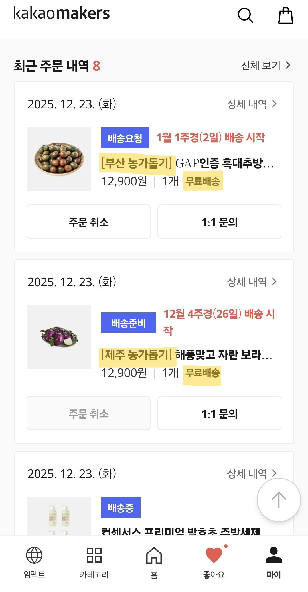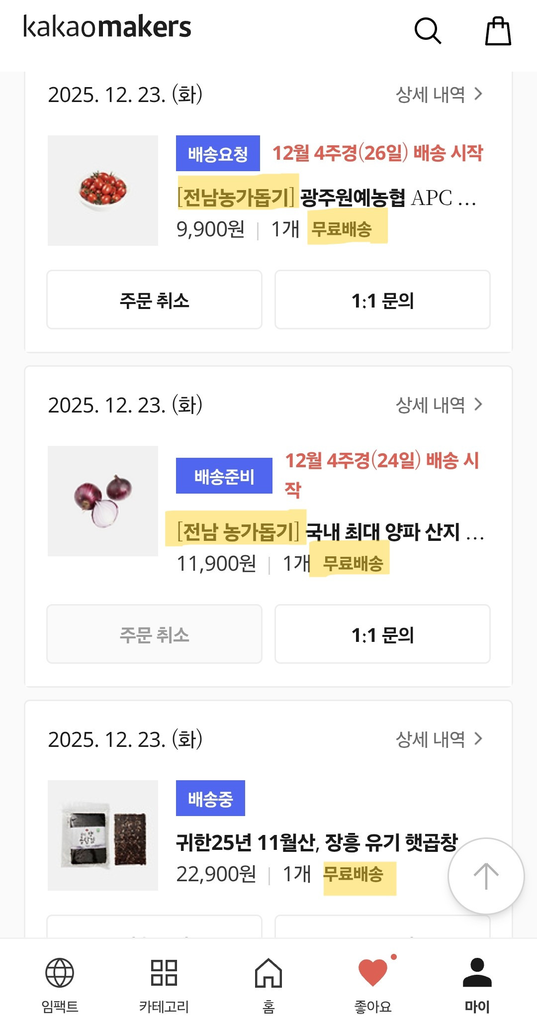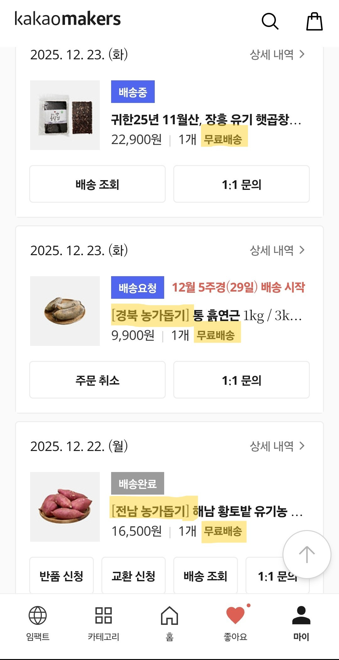 탈팡 후 카카오메이커스에서 우리 농산물을 샀습니다.