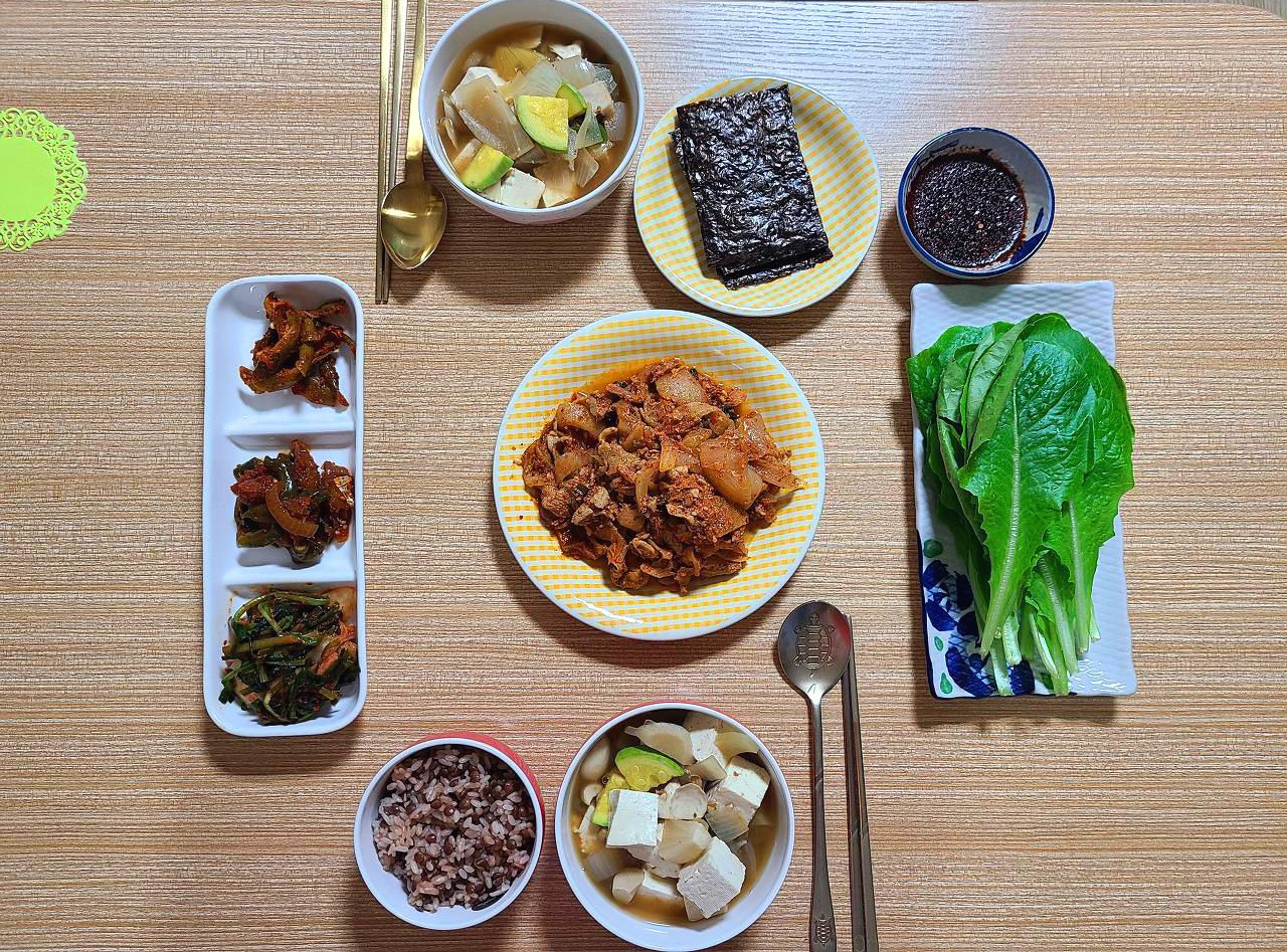 나름 예쁘게 상을 한 번 차려 봤습니다. 된장찌개 좋아하시는 저희 시부모님 상차림도 되지만 요즘 다이어트 중인 남편을 위해서도 이렇게 차려낸답니다.