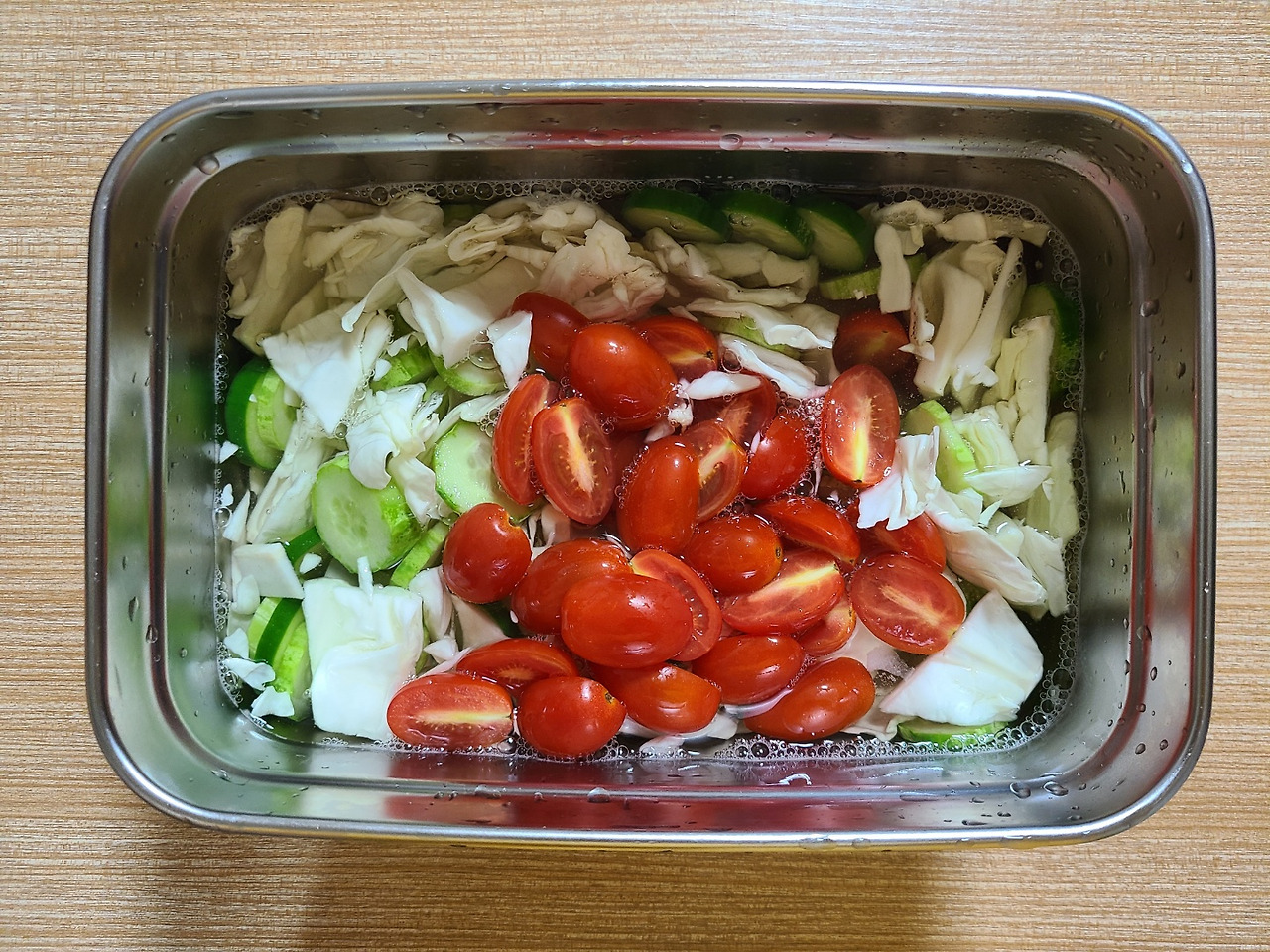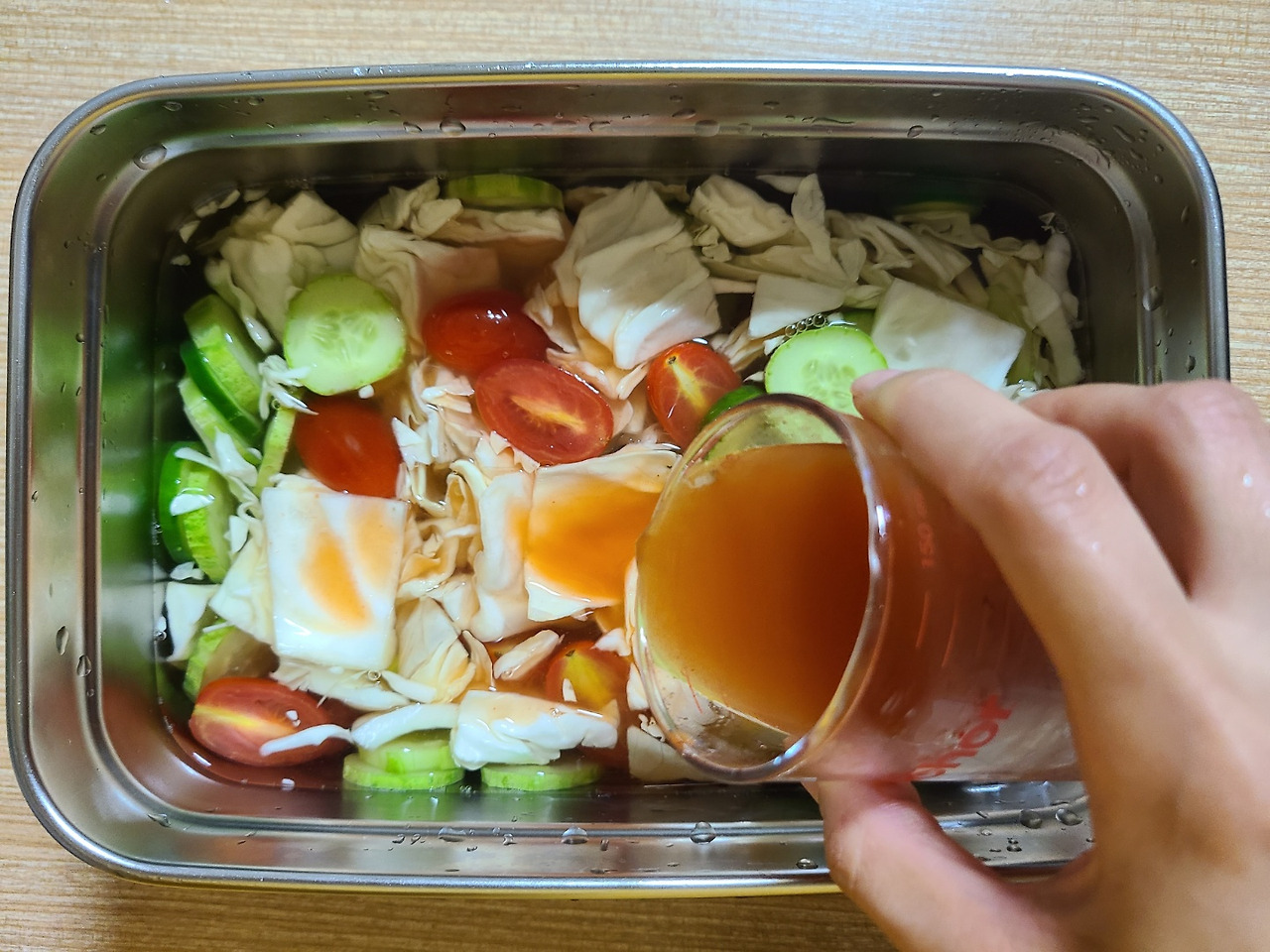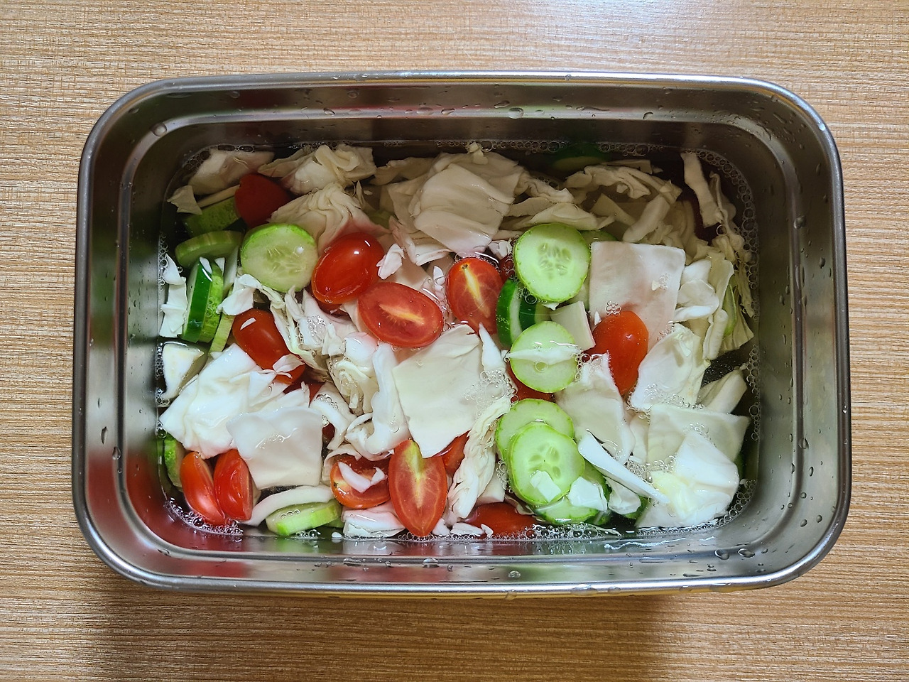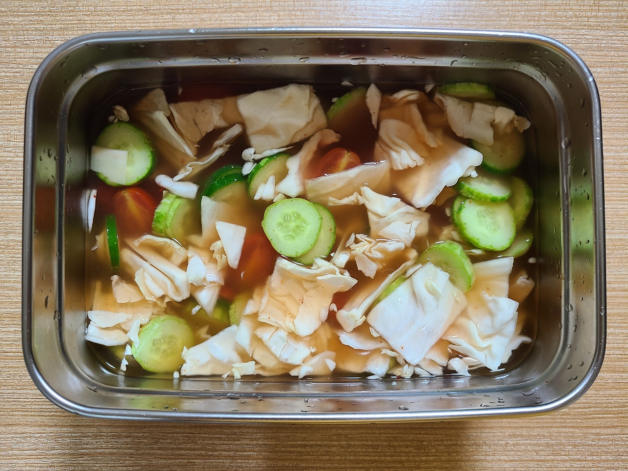하루만에 익지는 않아서 채소가 푹 익지는 않았지만 2~3일 정도 지나면 양배추가 잘 익어서 단맛이 더 나고 새콤한 맛이 더 잘 밸거라는 생각이 들었어요.
