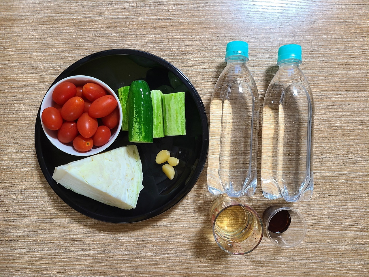 (탄산수와 식초를 쓰면 소금을 넣지 않아도 채소를 저염으로 절일 수 있어요.)