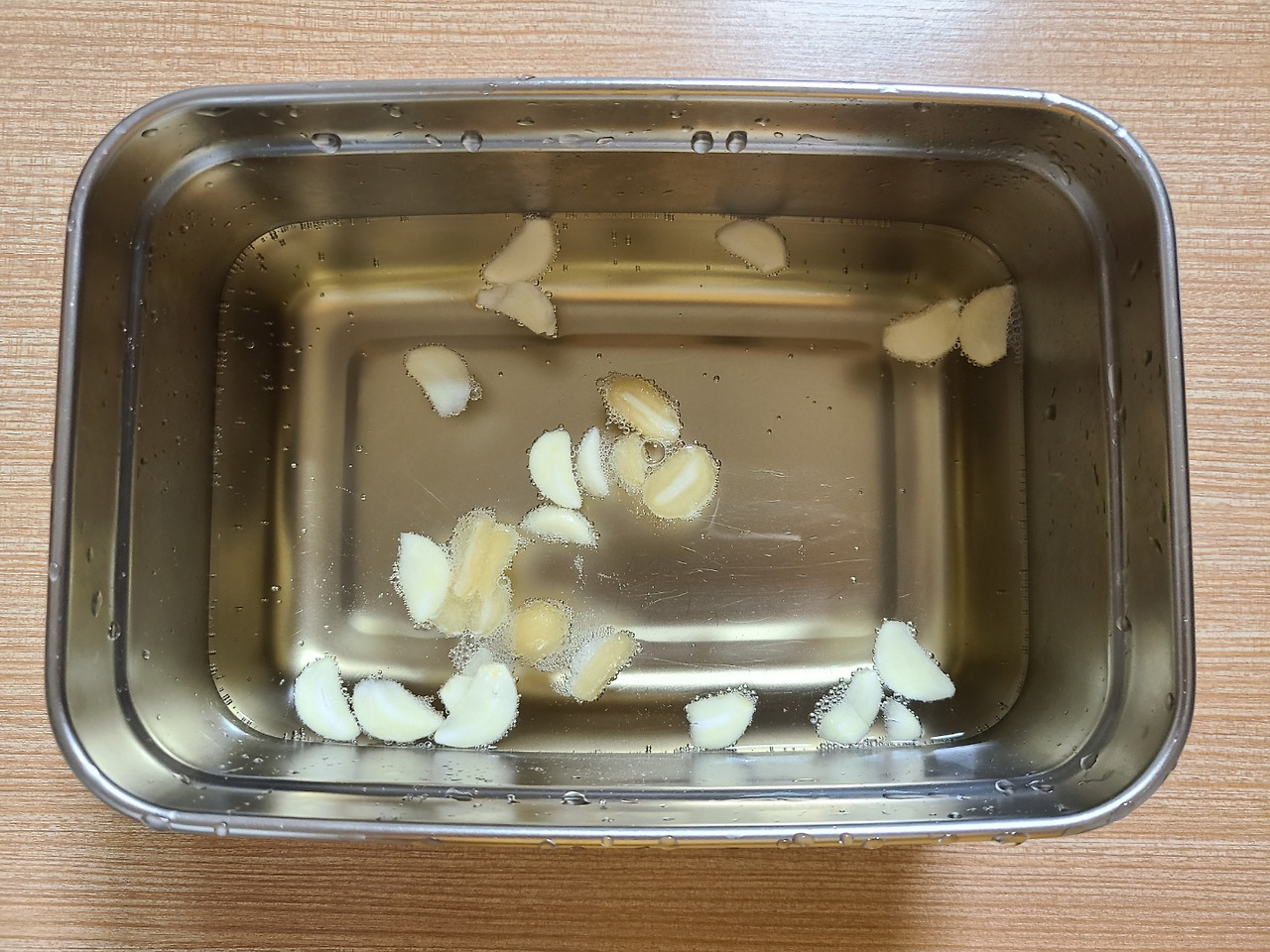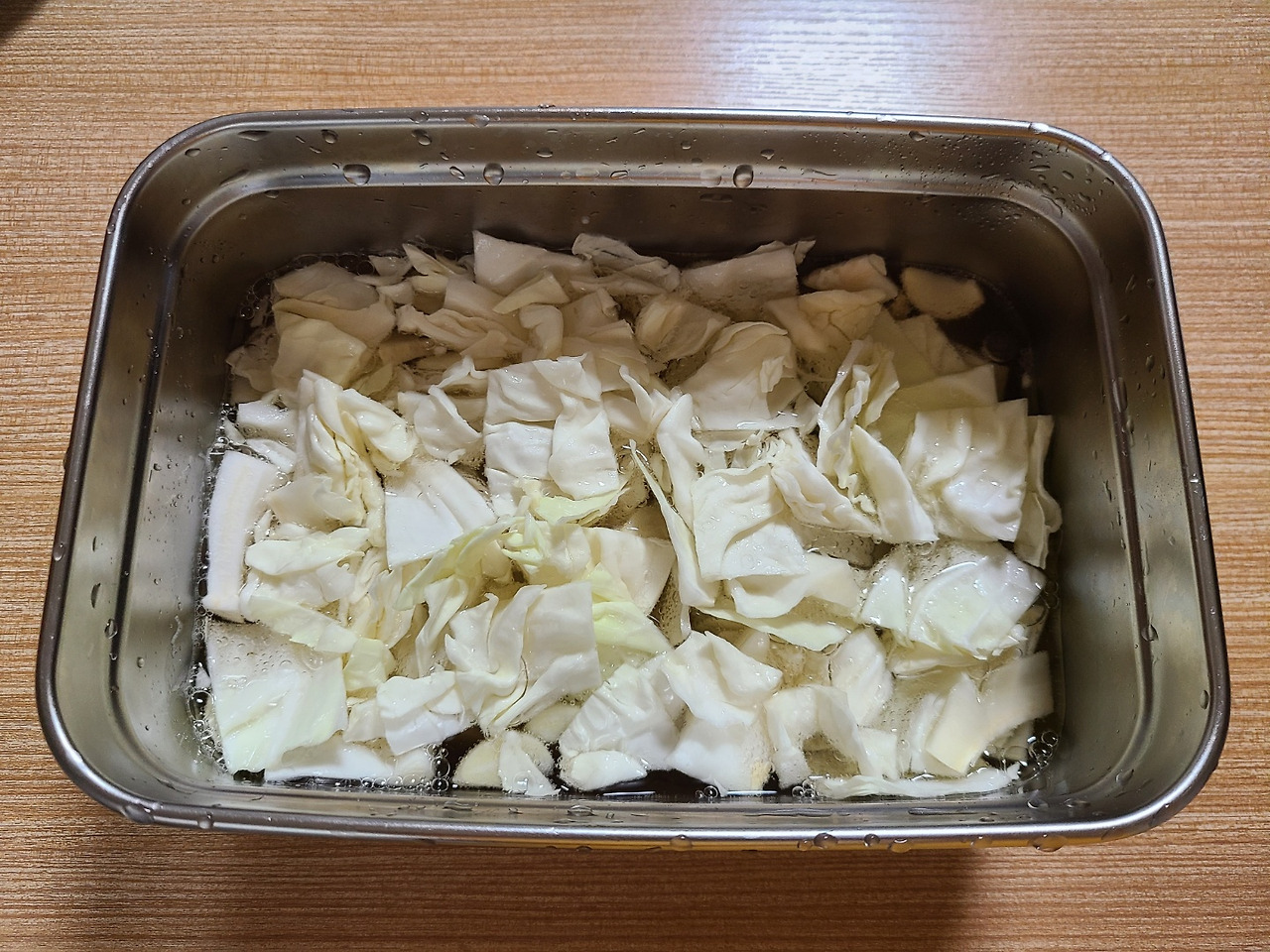 얇게 썬 마늘과 양배추를 넣고 다른 채소를 다듬을 동안 상온에서 절여줍니다.