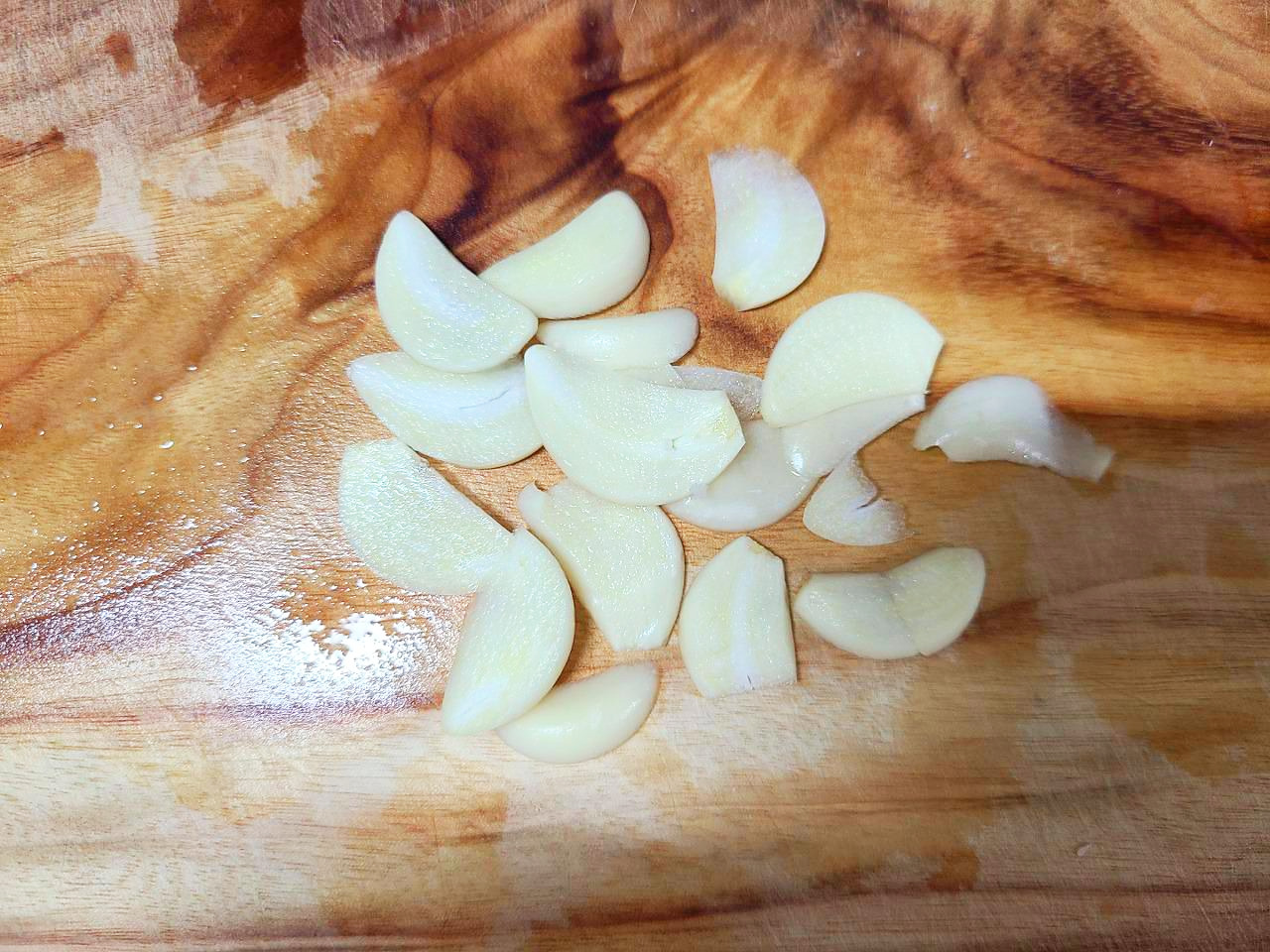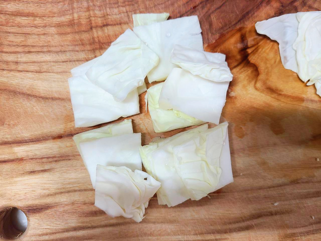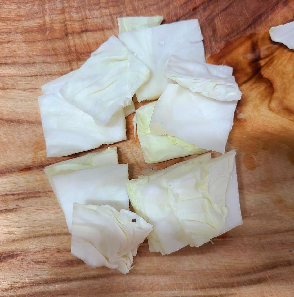 양배추는 나박나박하게 썰어주고 마늘은 편마늘로 썰어 주세요.