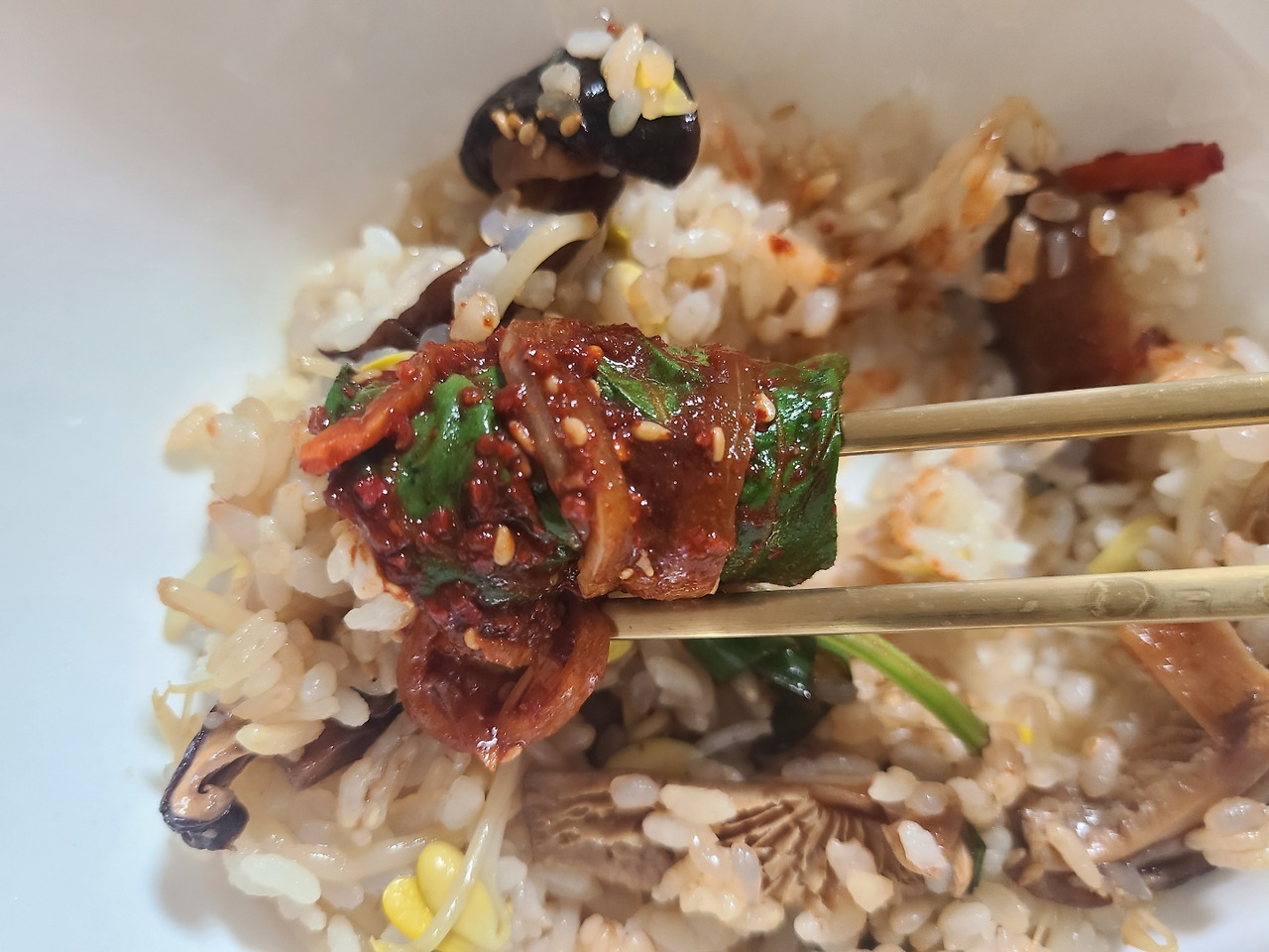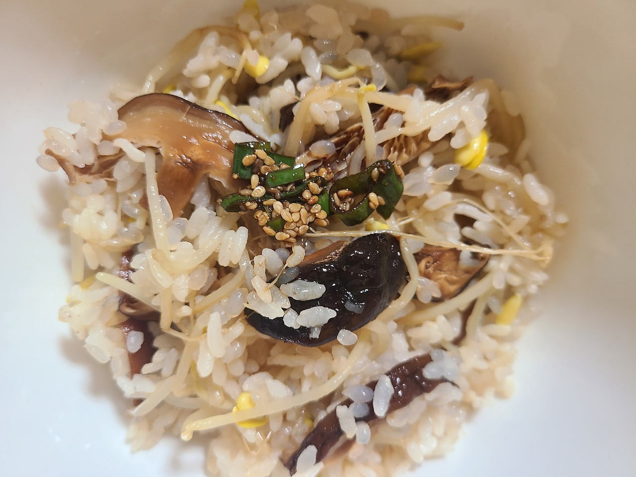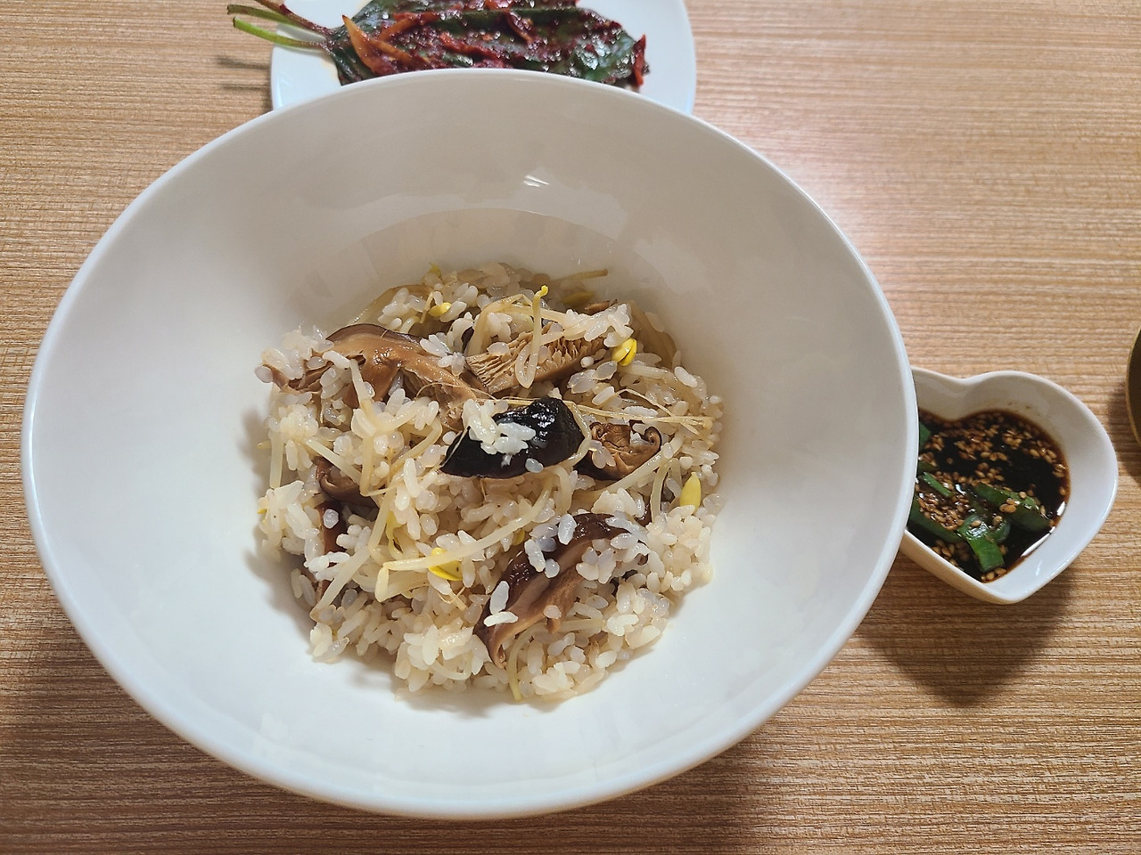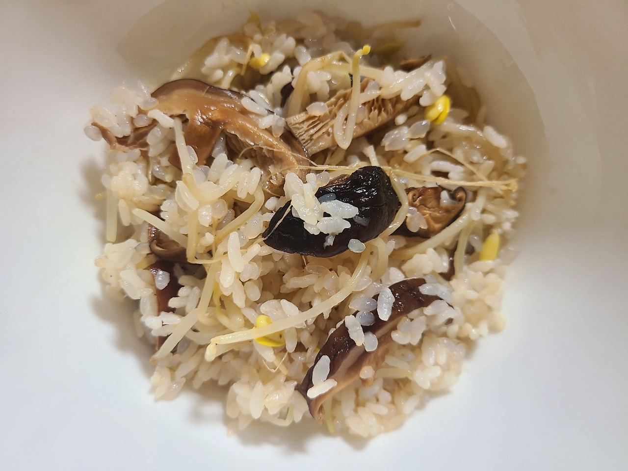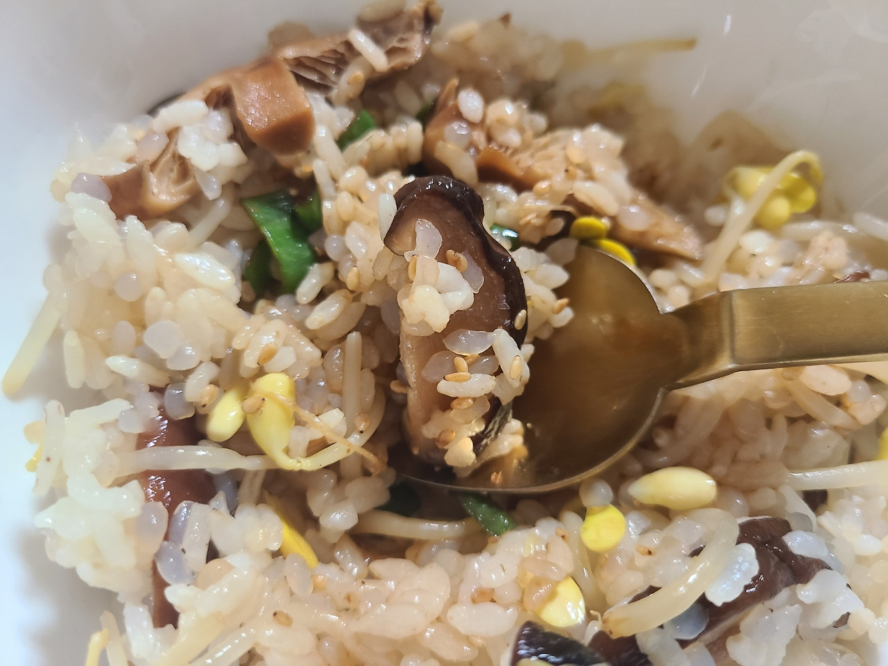 콩나물의 아삭아삭한 식감과 표고버섯향, 거의 쌀밥과 다름 없는 곤약쌀밥이 서로 잘 어우러져서 일반적인 표고버섯밥과 견주어도 손색이 없었어요.