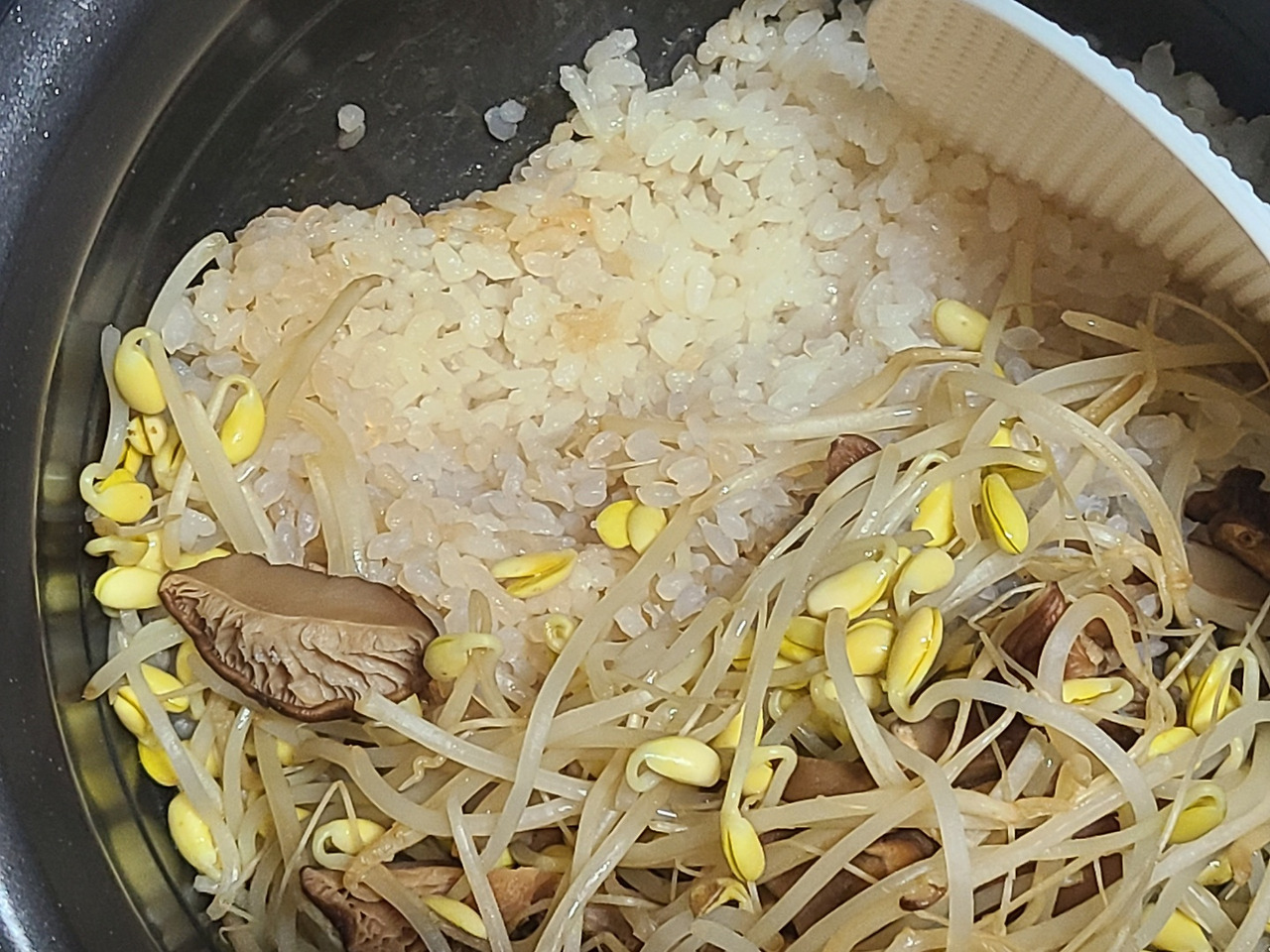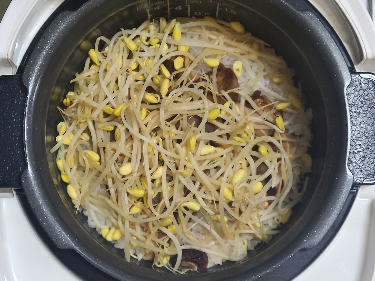 그 위에 곤약쌀, 표고버섯, 콩나물 순으로 넣고 밥을 앉혀주세요.