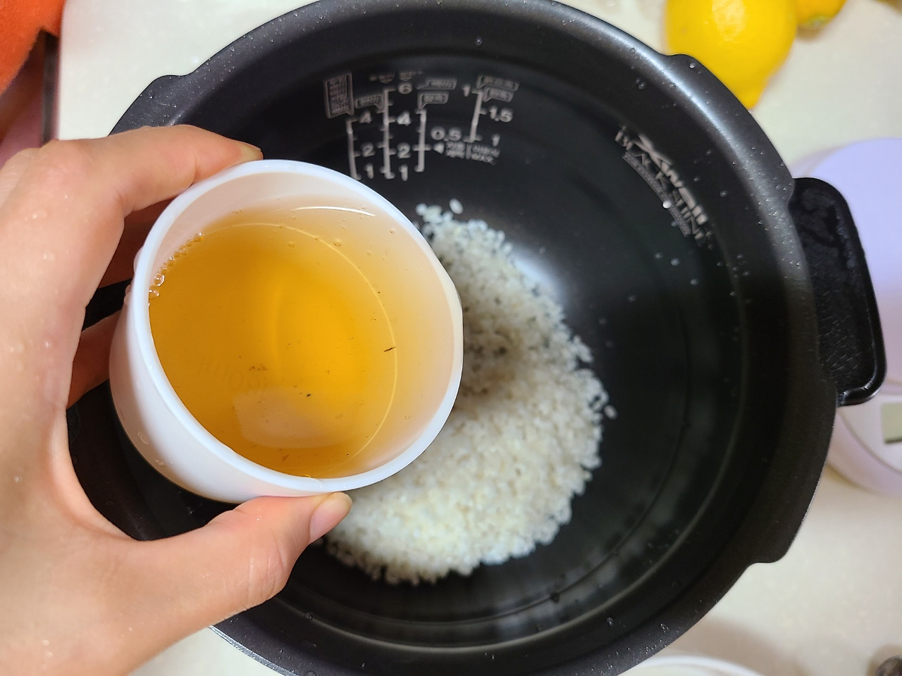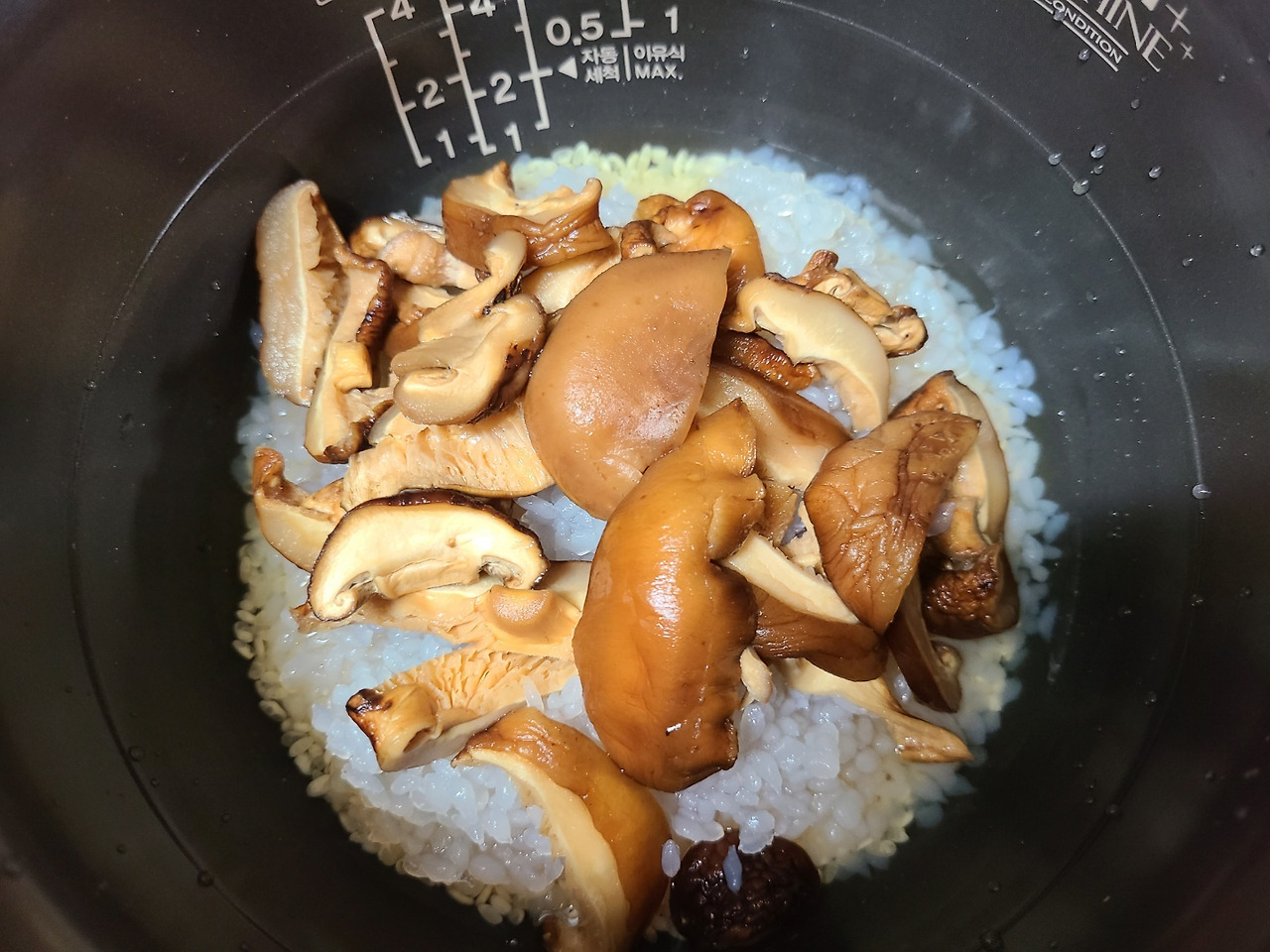 쌀을 밥솥에 넣고 표고버섯 우린 물 180ml를 부어줍니다.