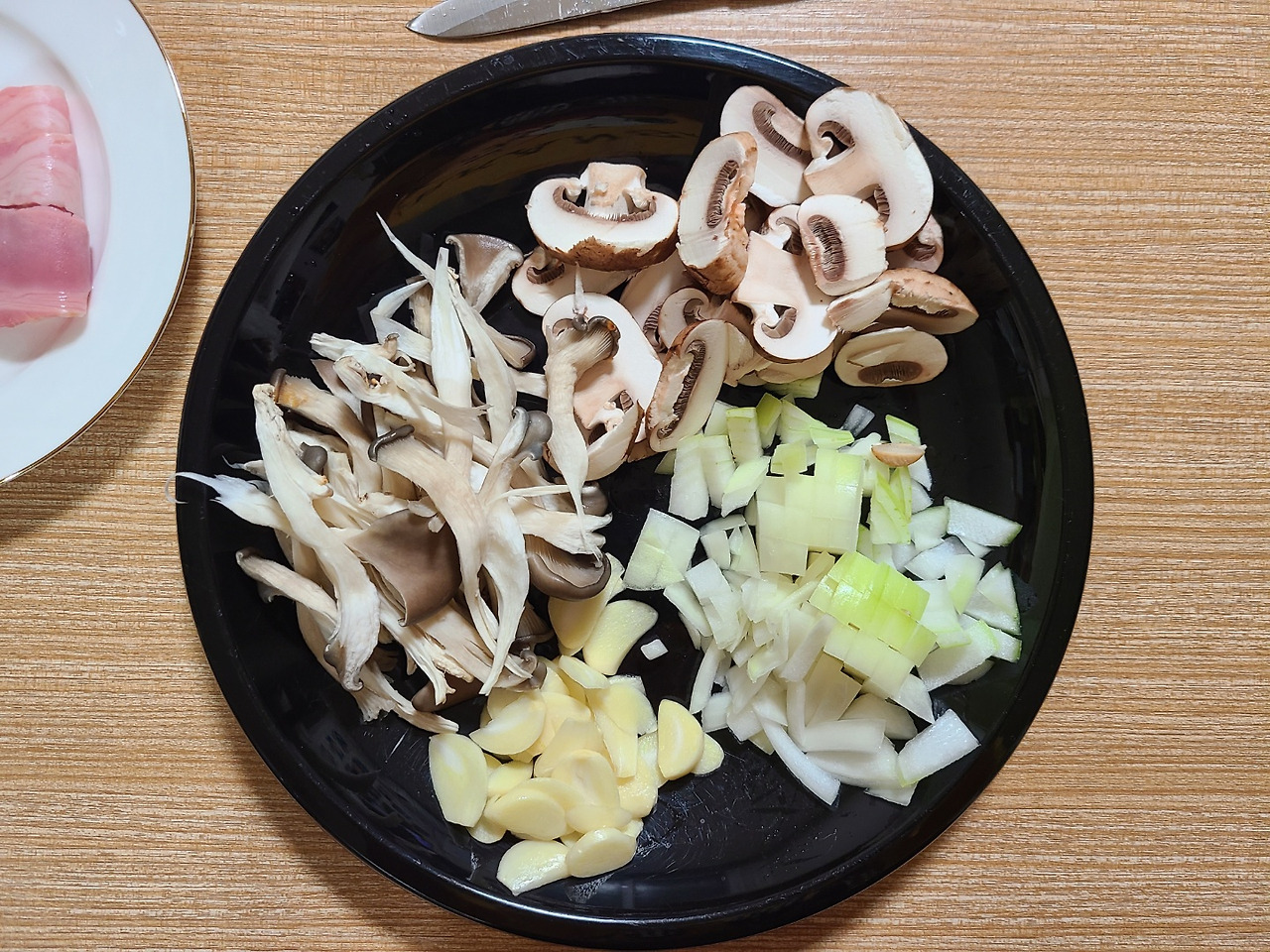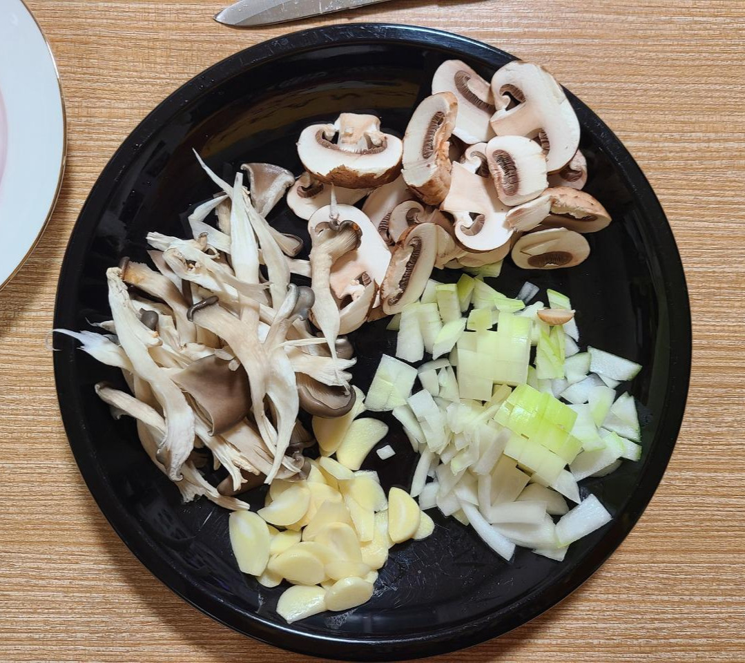 마늘은 얇게 편마늘로 썰어주고 양파고 잘 볶아질 수 있도록 가로세로 0.5cm 내외로 잘라줍니다. 느타리는 씻으면서 잘게 찢어주고 양송이는 얇게 썰어 줍니다.