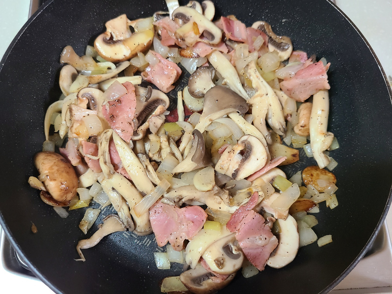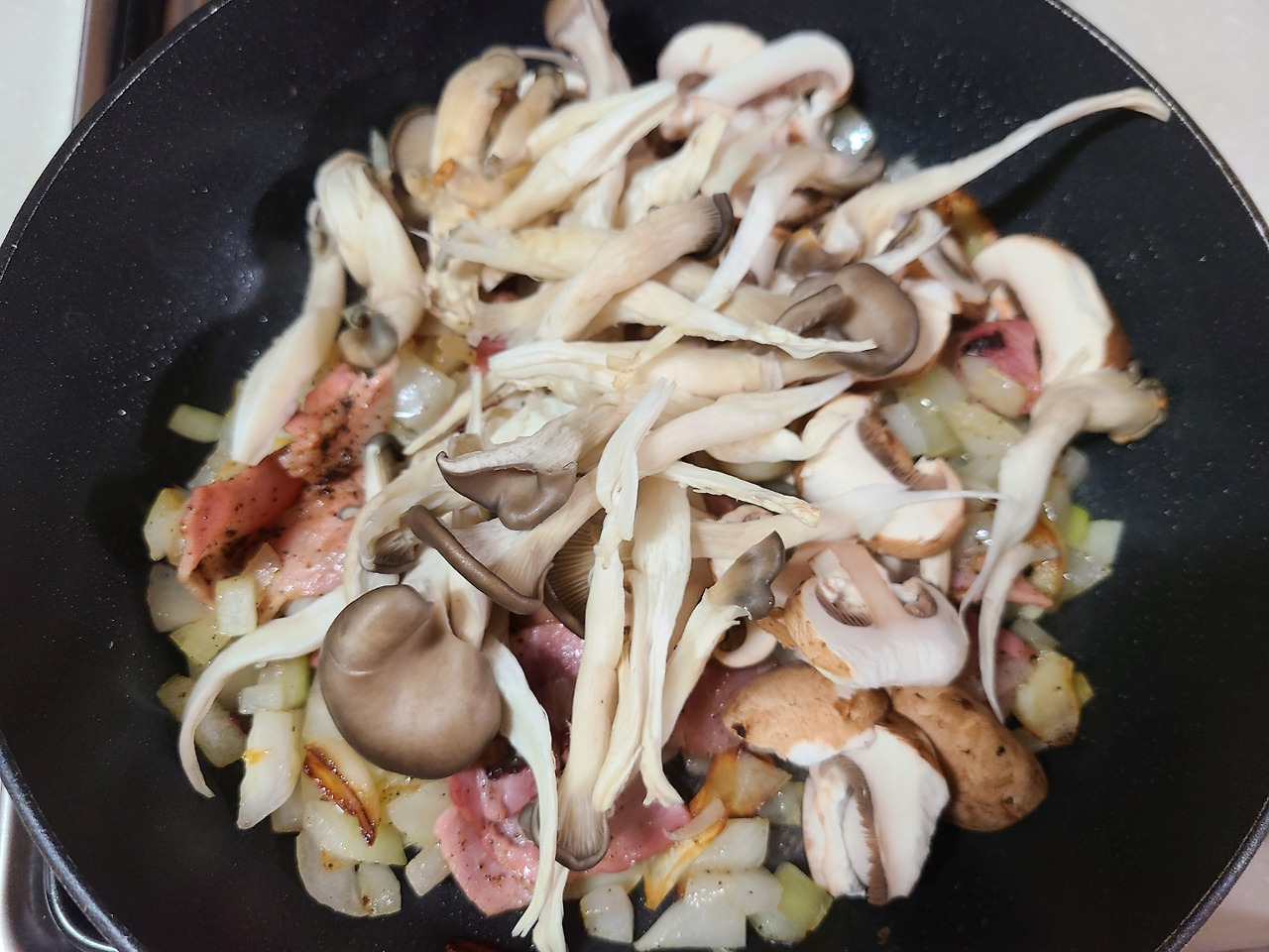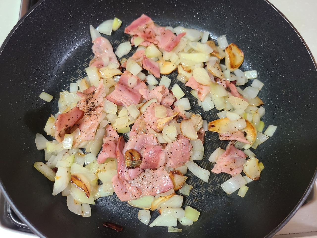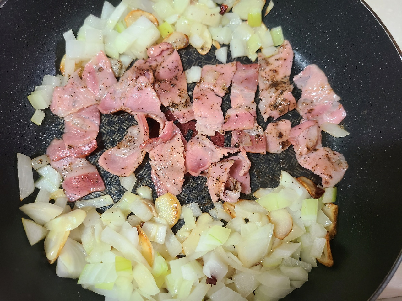 양파향이 어느정도 나오면 여기에 베이컨을 굽다가 후추를 뿌려줍니다.