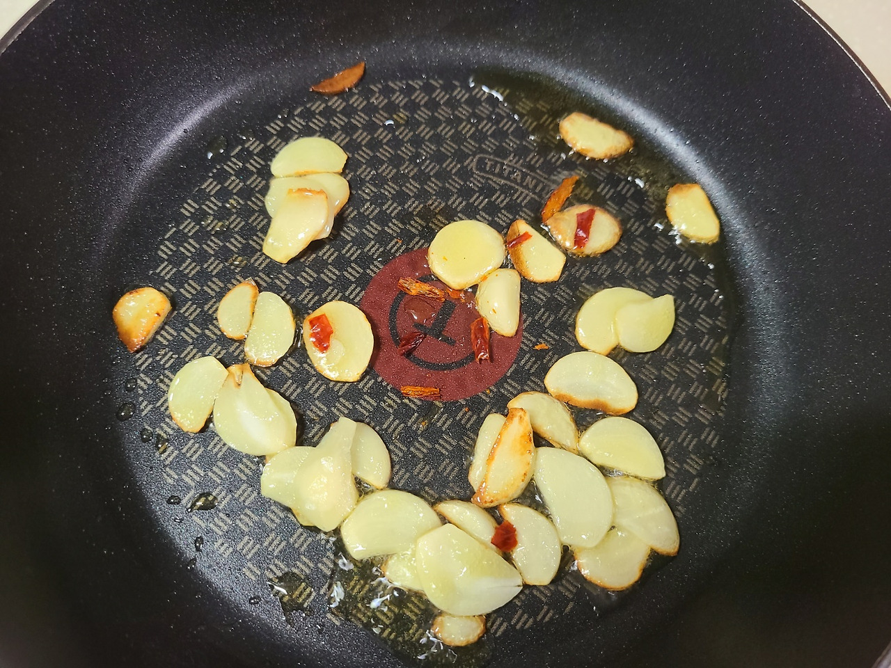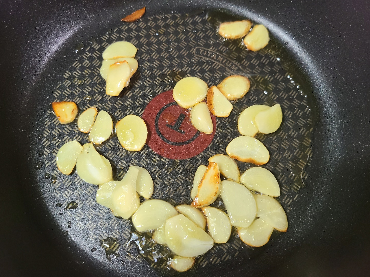 달궈진 팬에 올리브유를 두르고 마늘을 넣어 잘 볶아 줍니다.
