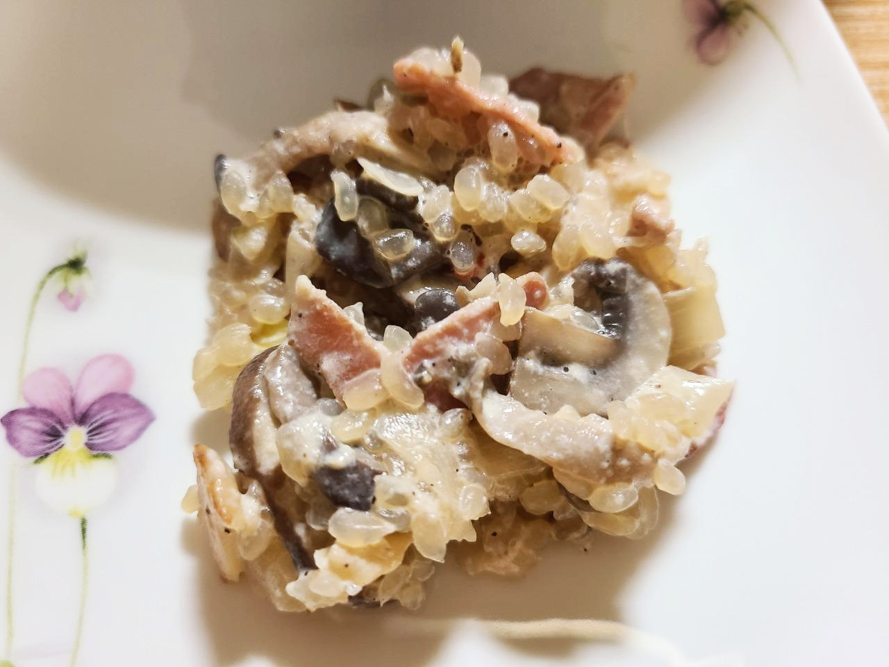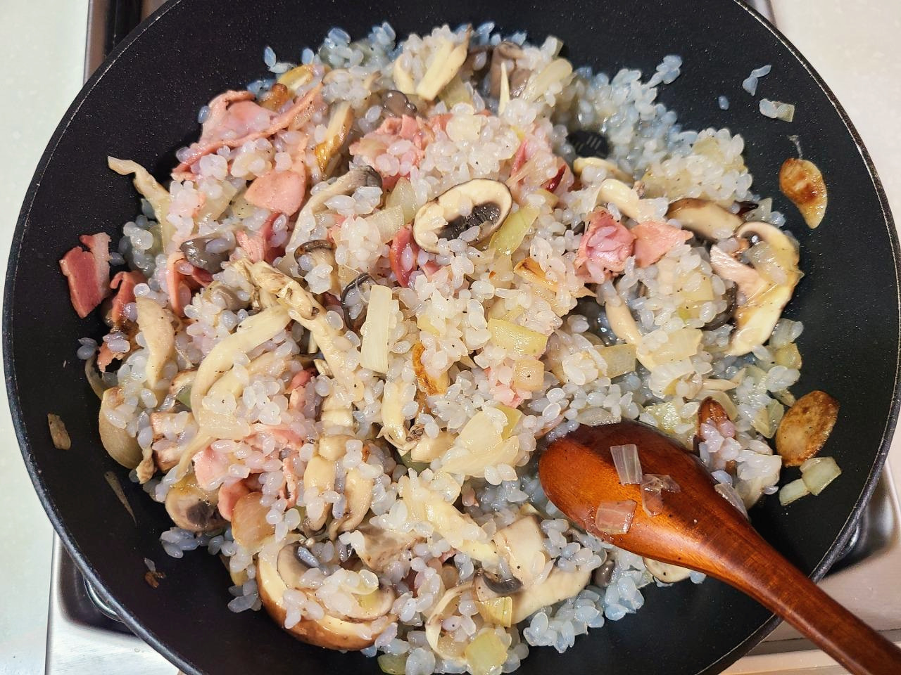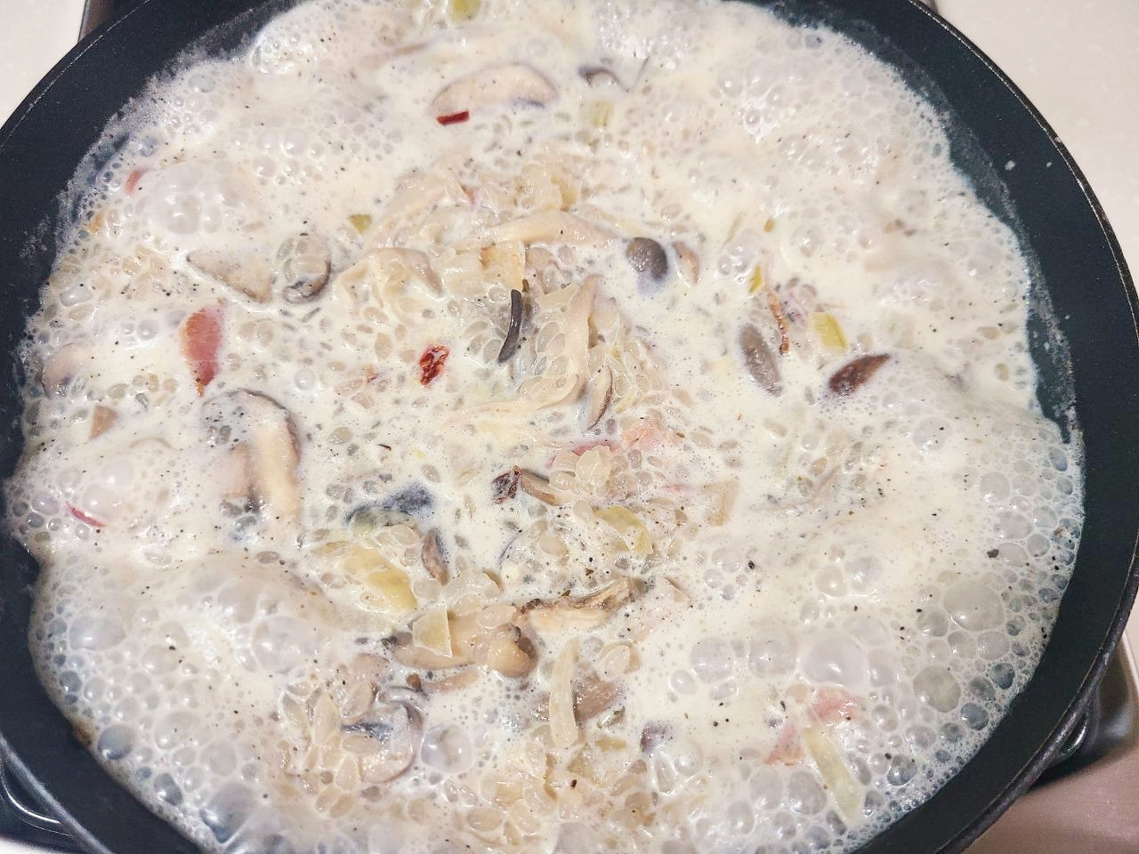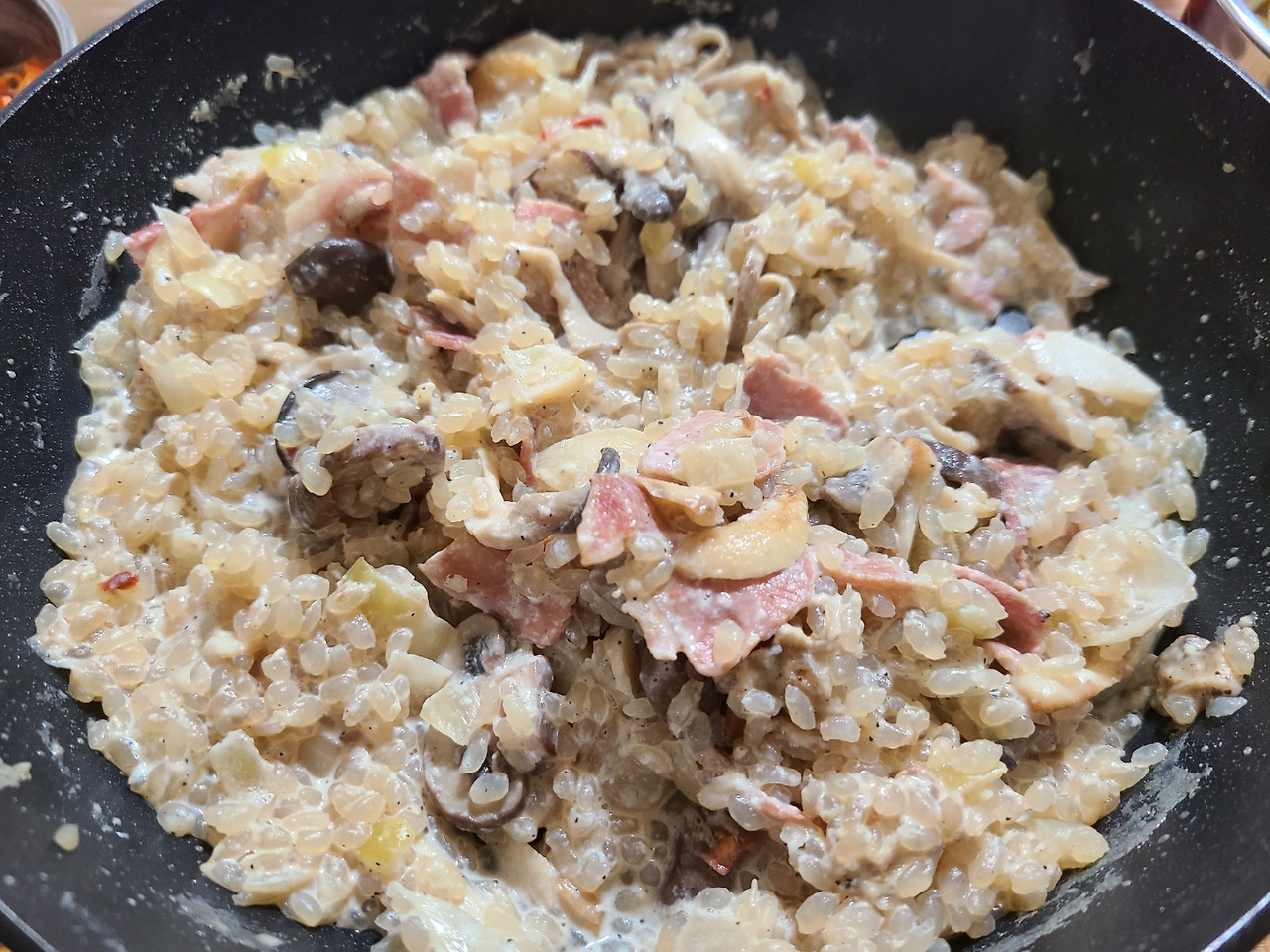 버터를 사용하지 않고 올리브유에 베이컨을 살짝 구워서 재료를 볶을거고 마늘, 양파를 많이 넣어서단맛과 풍미를 살릴거예요. '밥'처럼 먹는 요리이기 때문에 아예 간을 하지 않거나 간을 한다 하더라도 '허브솔트'를 사용해서 염분 섭취량을 줄일거고 버섯향과 베트남고추를 활용해서 심심한 간을 잡아 줄겁니다.