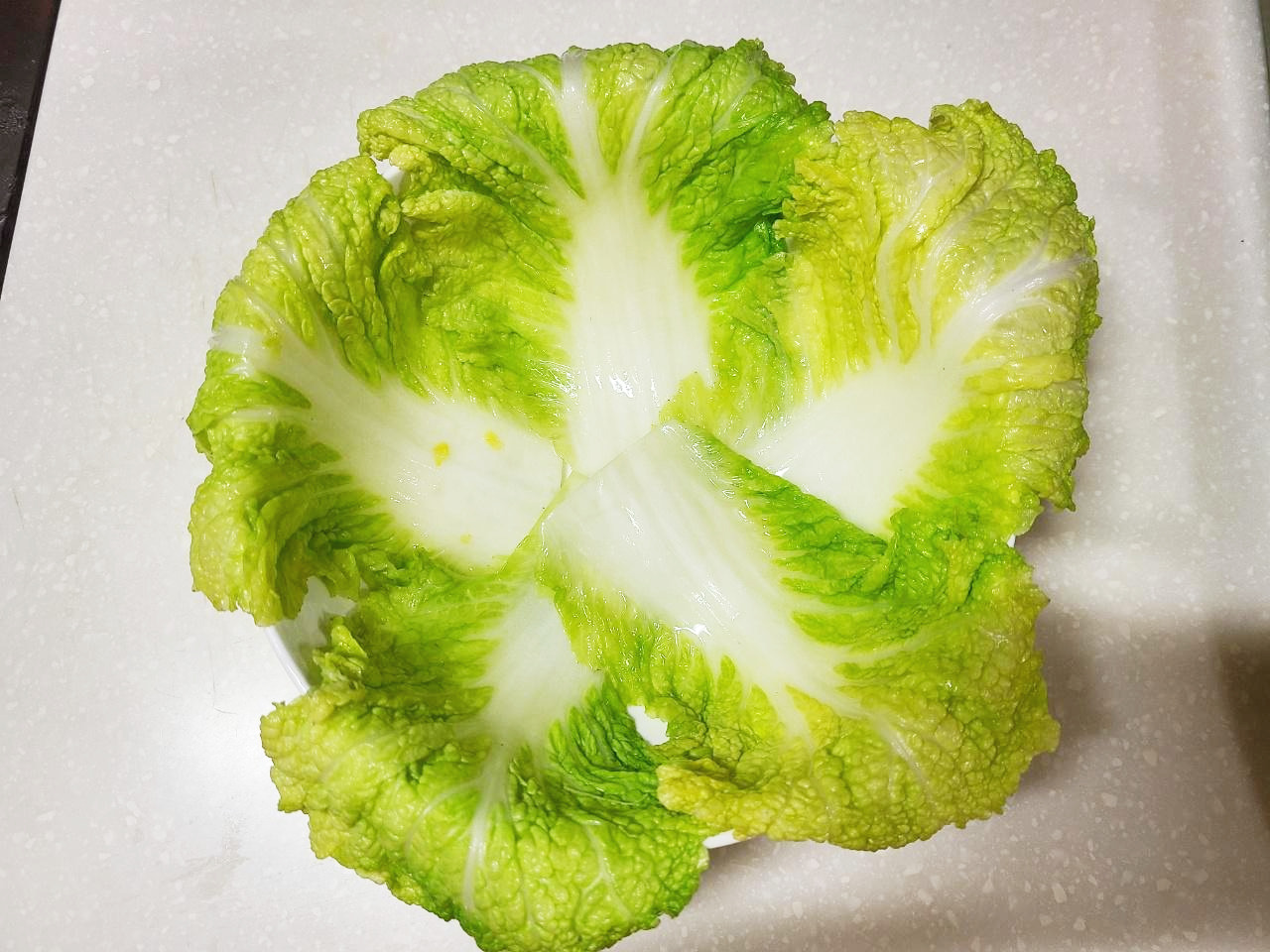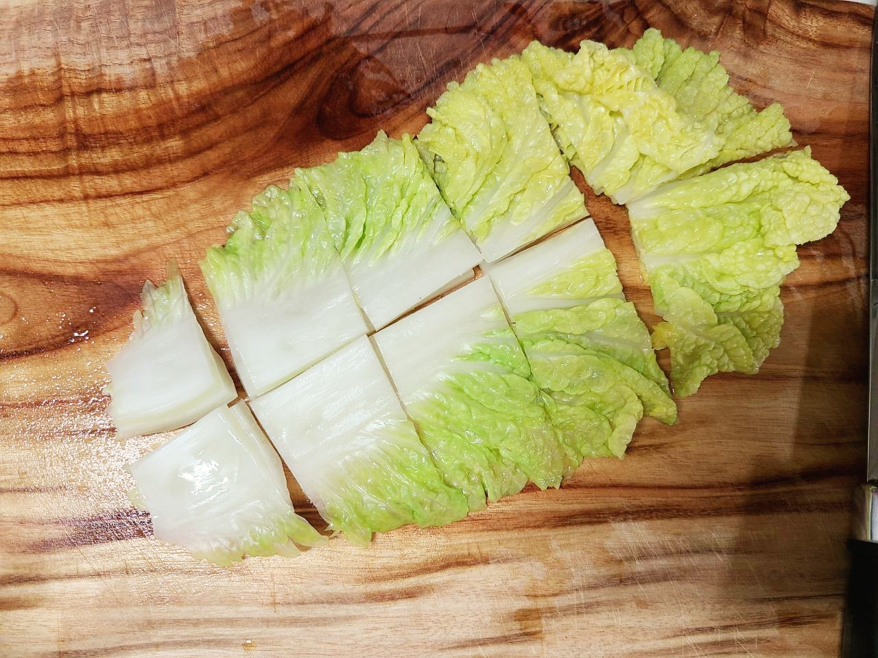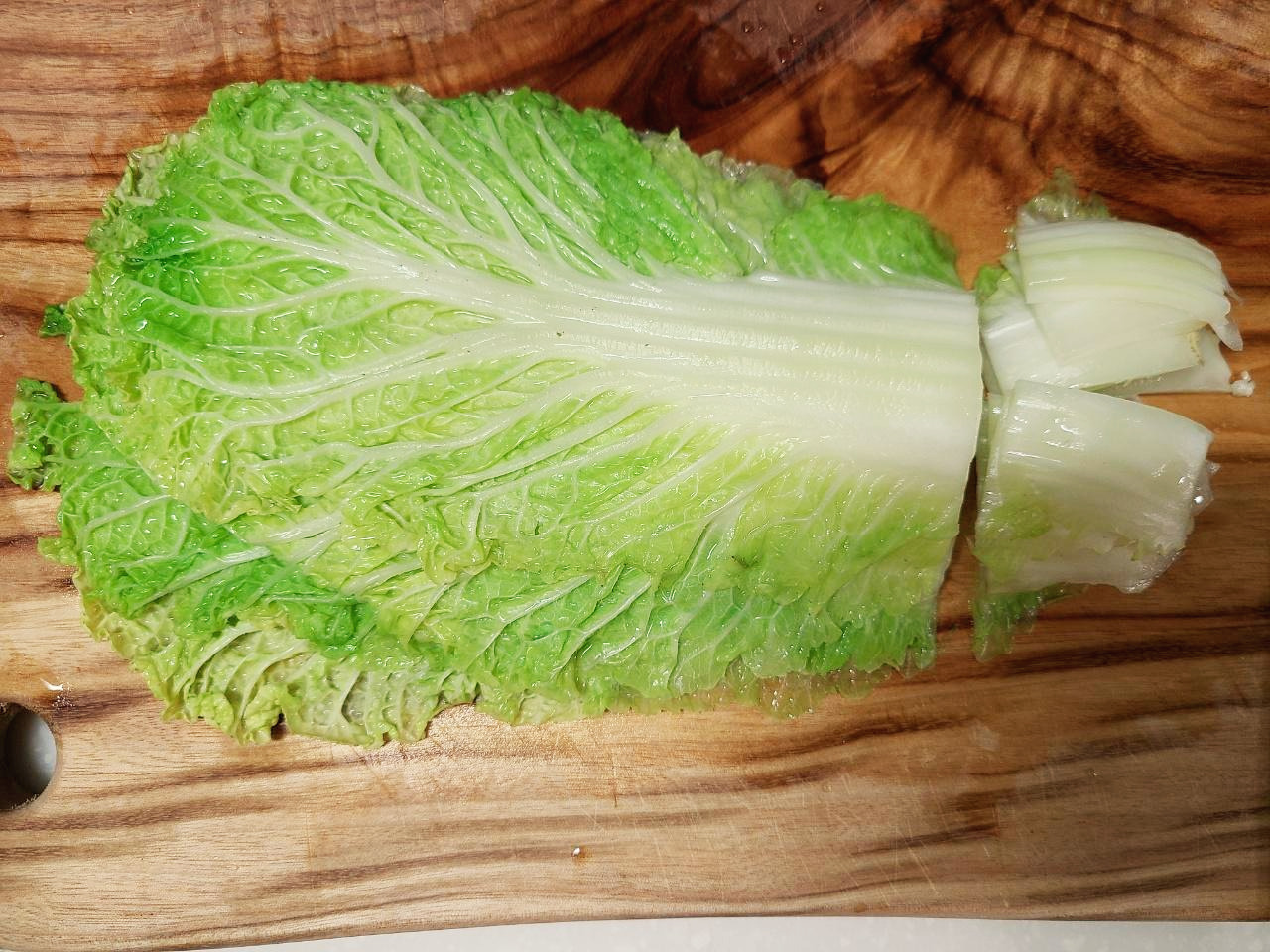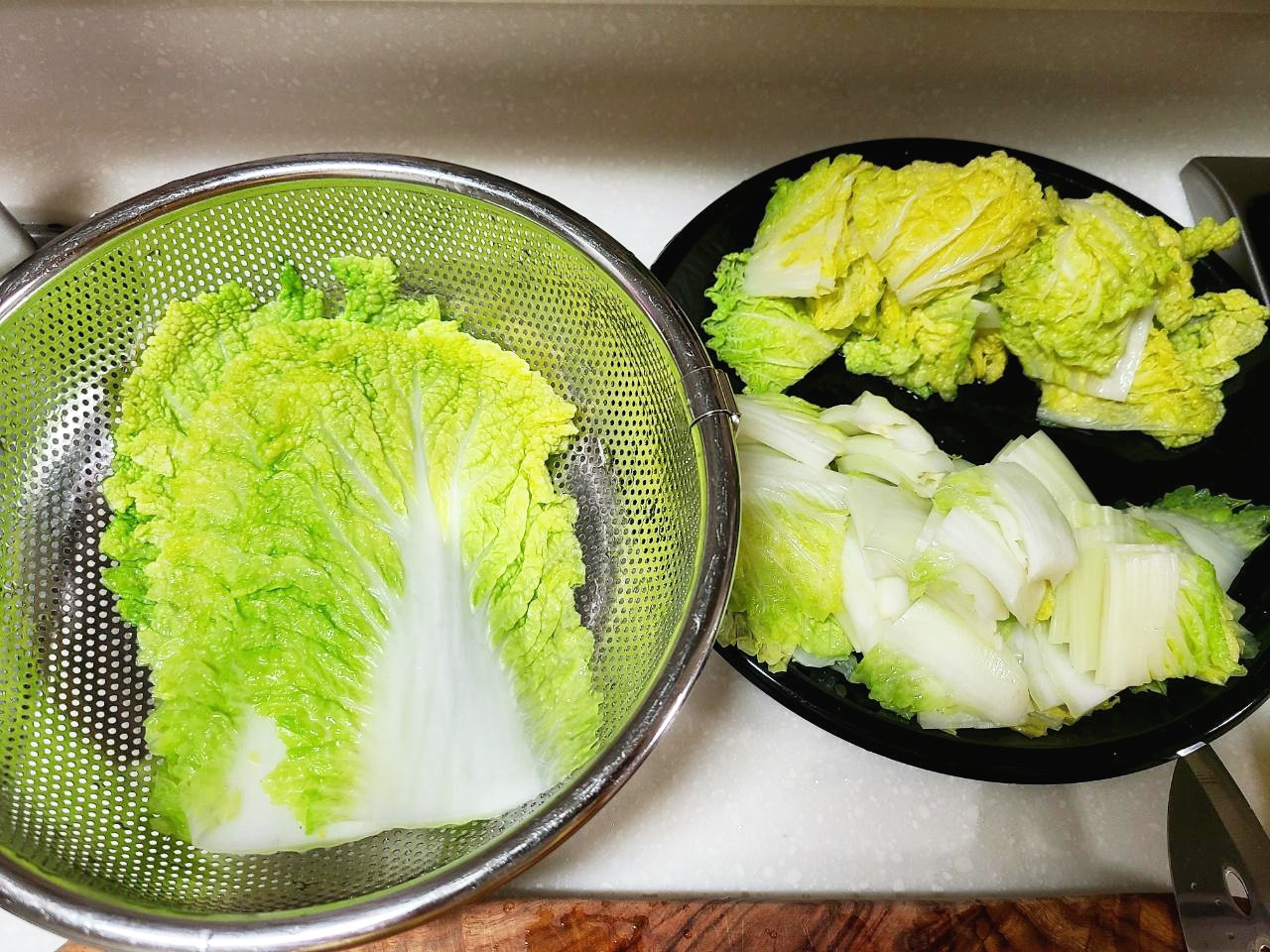 식은 배추는 줄기 부분, 이파리 부분 각각 3cm로 잘라 따로 준비하고 가장 넓은 잎사귀 5개는 줄기 밑부분만 자른 다음 잎사귀는 자르지 않고 준비합니다.