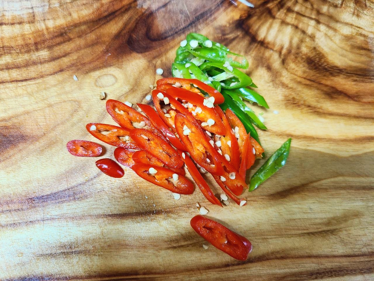 청고추, 홍고추를 어슷썰어 준비합니다.