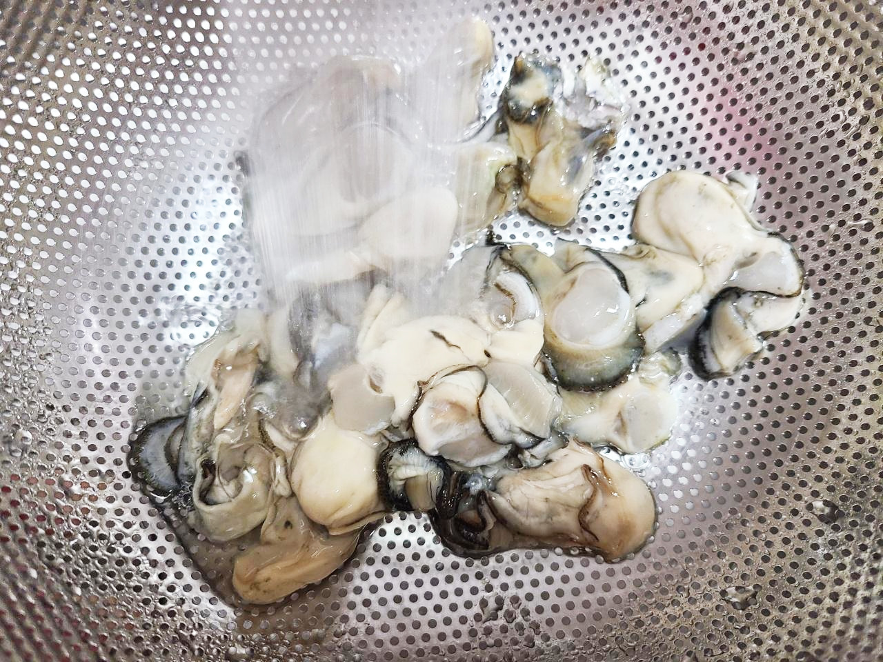 (굴은 식촛물은 빼고 알맹이만 넣으시고 굴을 넣은 후엔 숟가락으로 잘 섞어 주세요.)