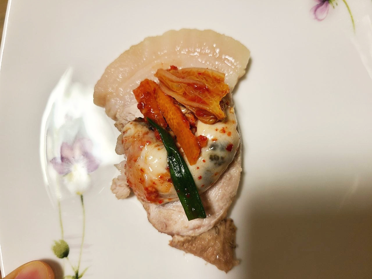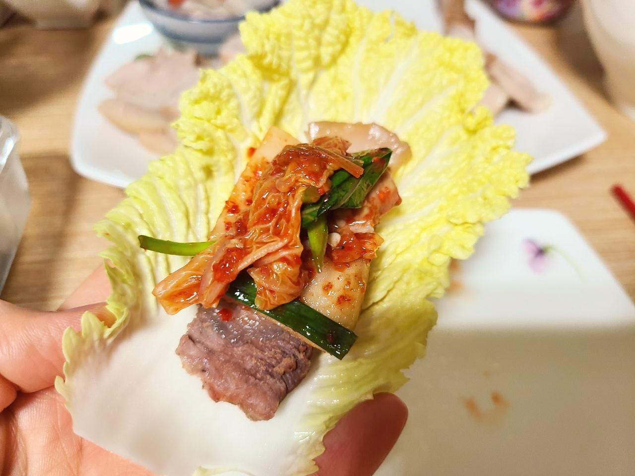 바로 담근 김치인데 짜지 않고 간이 딱 맞아 좋았어요. 확실히 살짝 데쳐낸 배춧잎 속에 김치양념이 잘 배어 있었습니다.