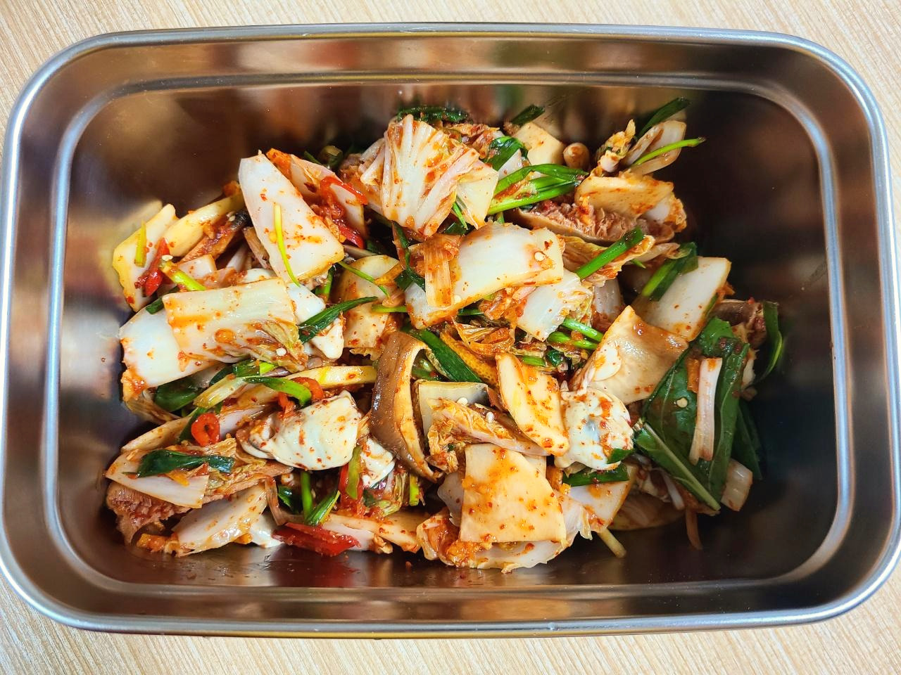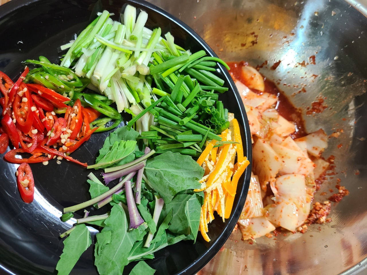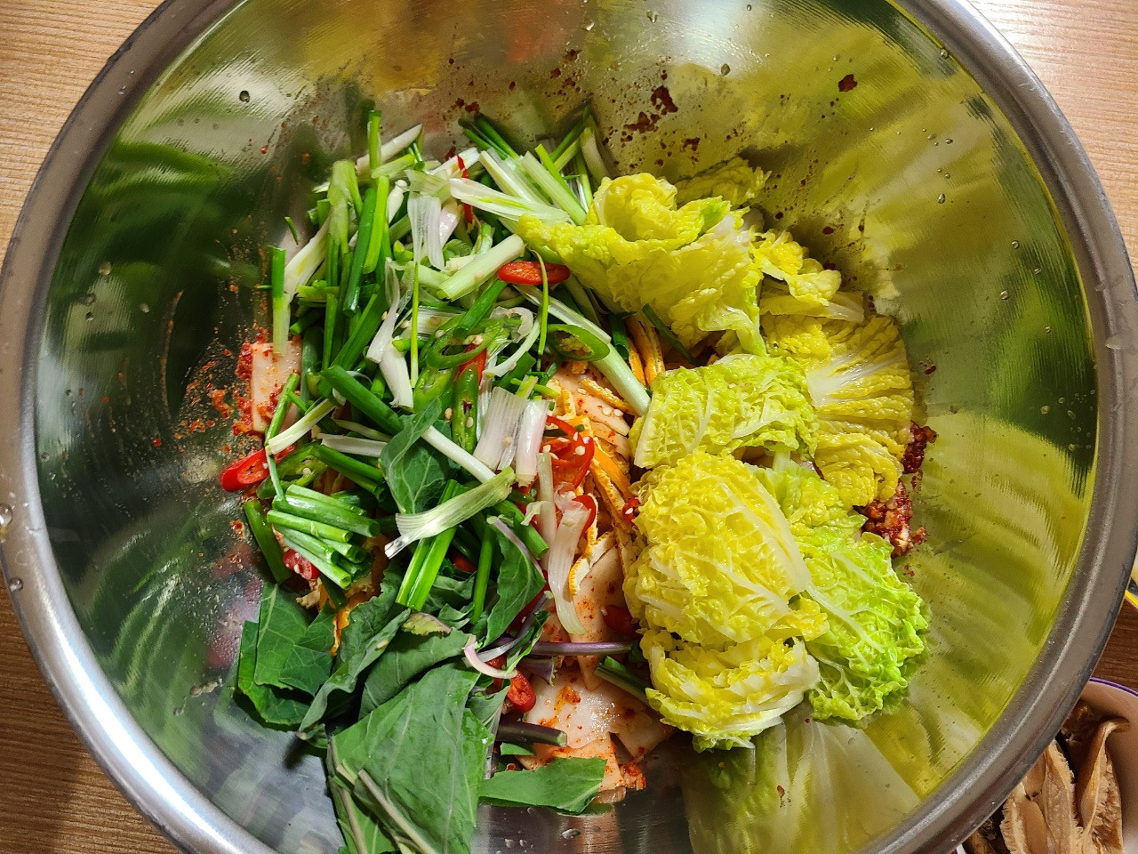 배추 이파리와 나머지 부재료(쪽파, 귤껍질, 콜라비 잎, 청고추, 홍고추, 표고버섯, 굴)를 넣고 잘 섞어 줍니다.