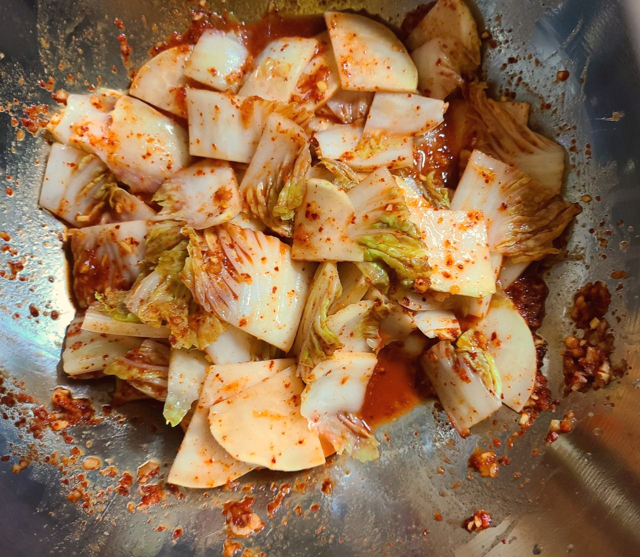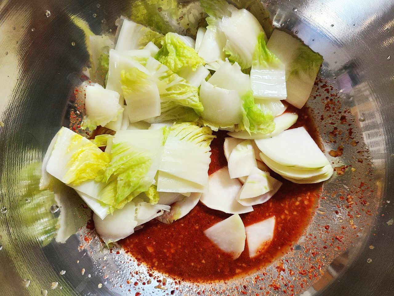 김치양념에 배추 줄기부분과 콜라비(무 부분)를 넣고 한번 버무려 준 다음