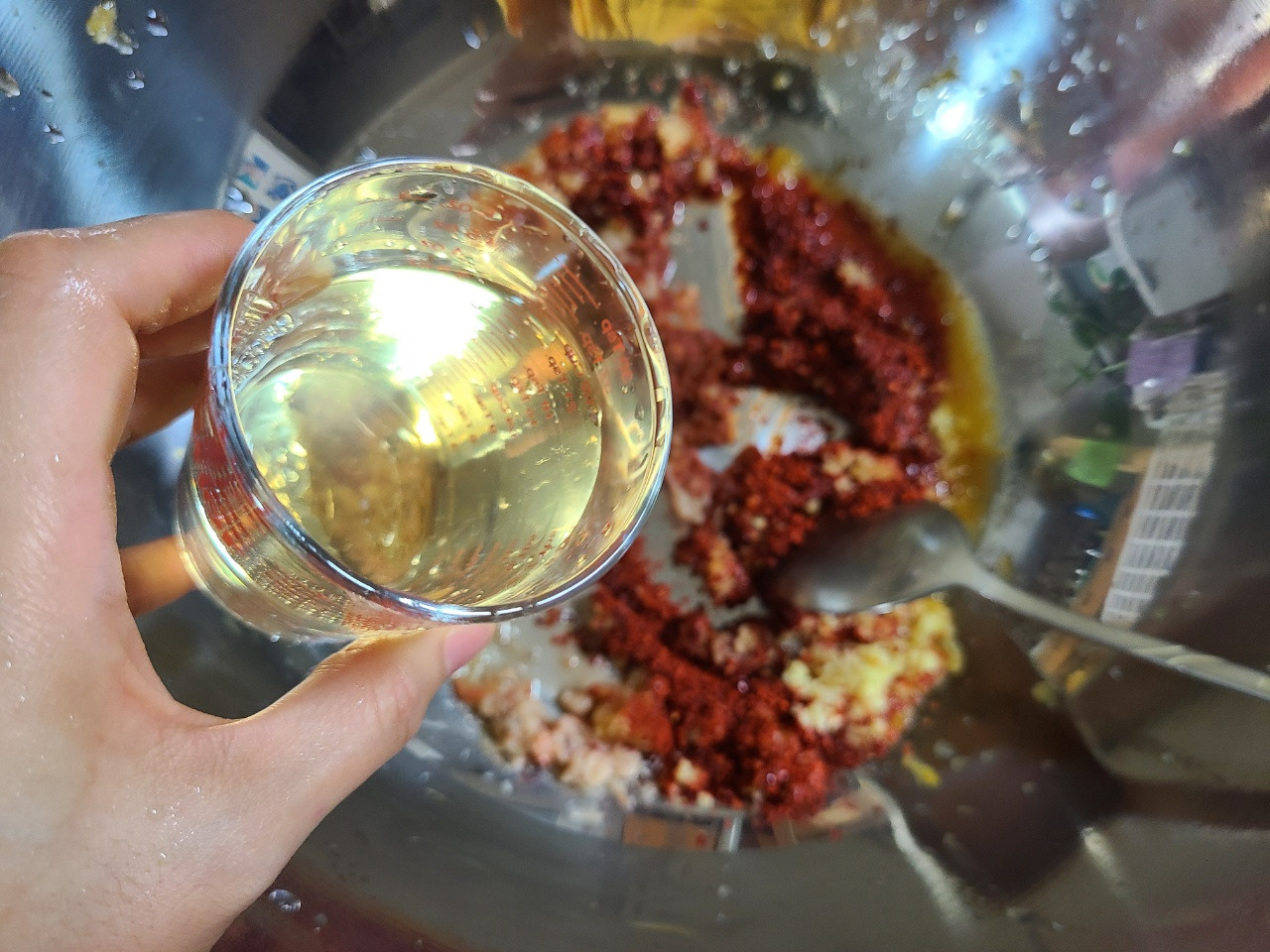 감귤즙을 짜넣은 다음 고춧가루, 새우젓, 액젓, 다진마늘, 생강을 넣고 잘 섞어 줍니다. 여기에 식혀 두었던 표고버섯 우린물 100ml를 넣고 잘 섞어 줍니다.