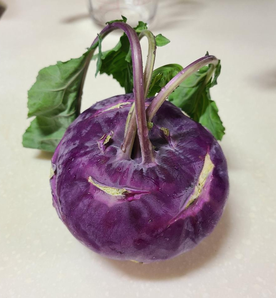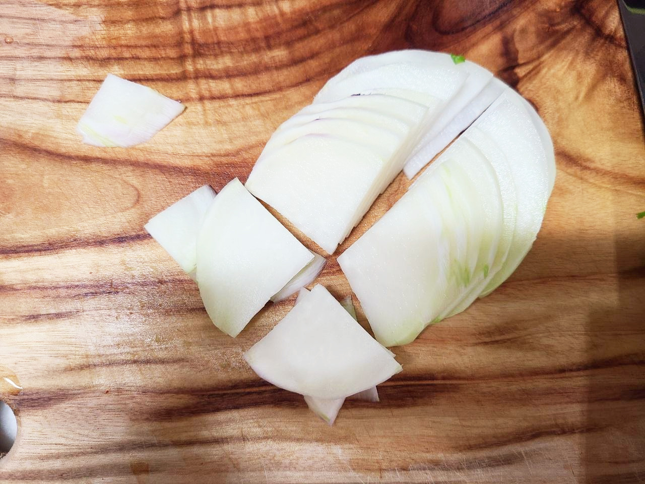 콜라비는 껍질을 깐 다음 0.3cm 두께로 잘라 4등분 해줍니다. 줄기 부분도 버리지 않고 잘 씻어서 3cm 길이로 잘라줍니다.