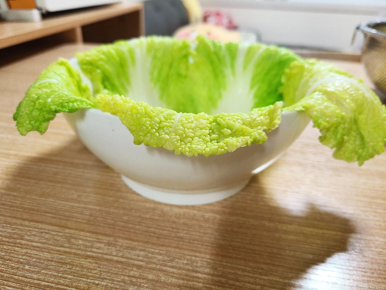 오목한 그릇에 남겨 두었던 배추 잎사귀를 널어 줍니다.
