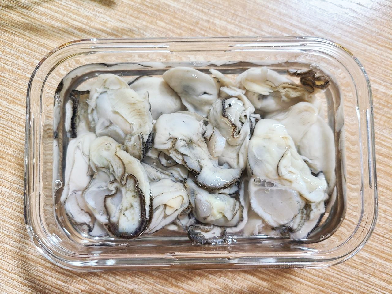 굴을 흐르는 찬물에 깨끗이 씻은 다음 식촛물 (식초 15ml + 물 150ml)에 담가서 냉장실에 보관해줍니다.