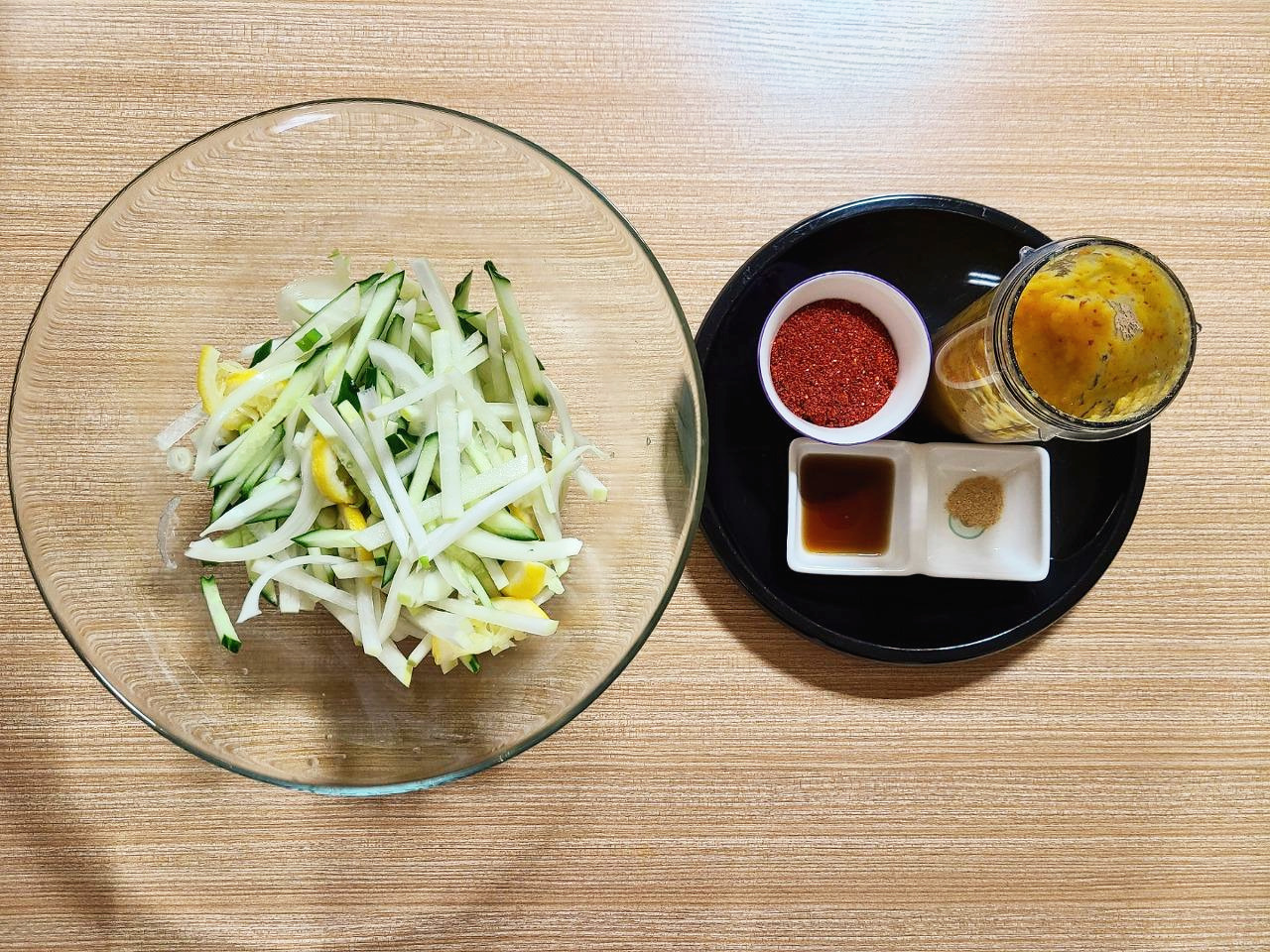 넓은 볼에 무, 오이, 양파, 대파를 같이 넣어 준비하고