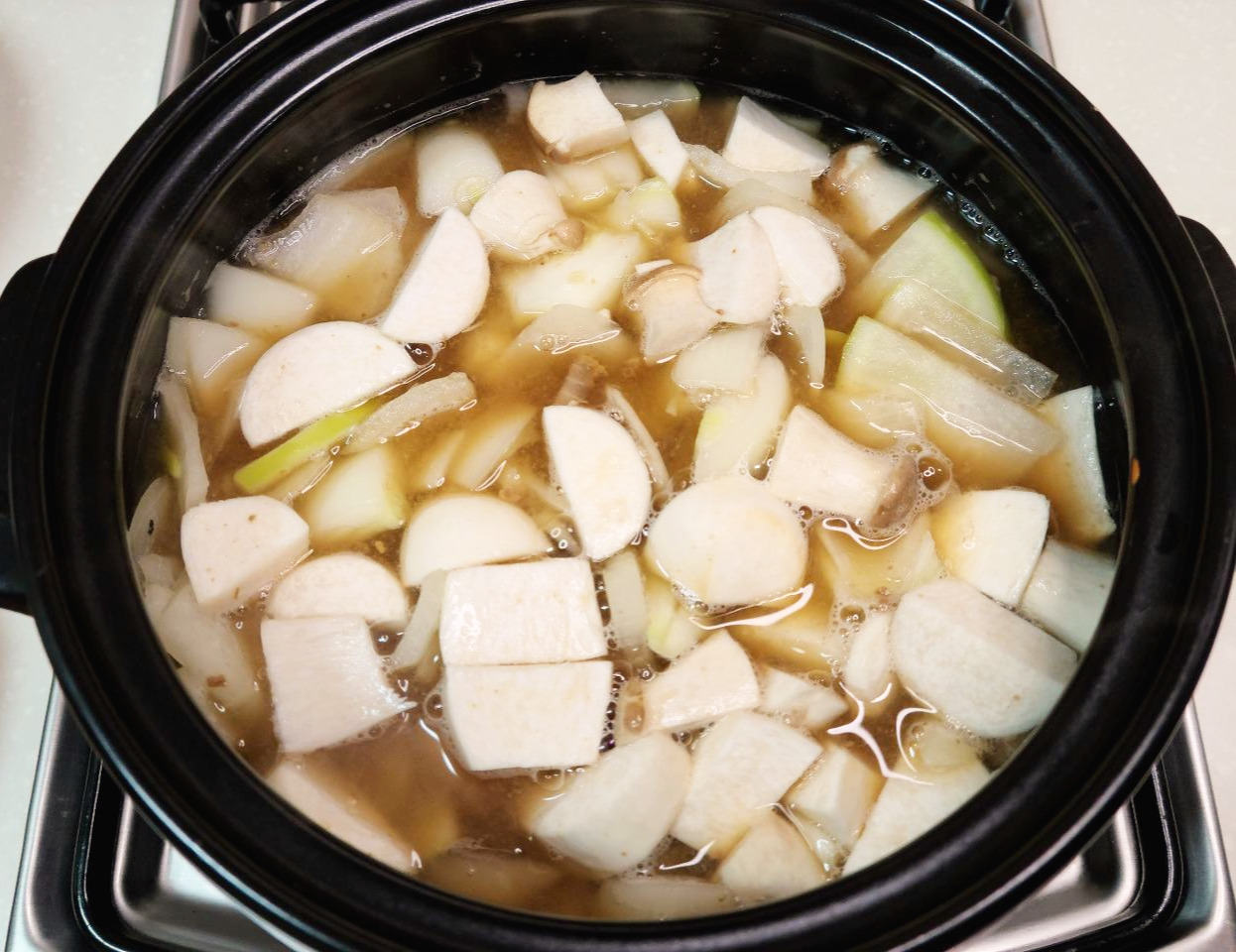 보통은 청국장찌개에 감자를 넣거나 쌀뜨물을 넣어 국물을 걸쭉하게 만드는데 저는 무를 넣어서 깔끔하고 시원한 국물을 낼거예요.