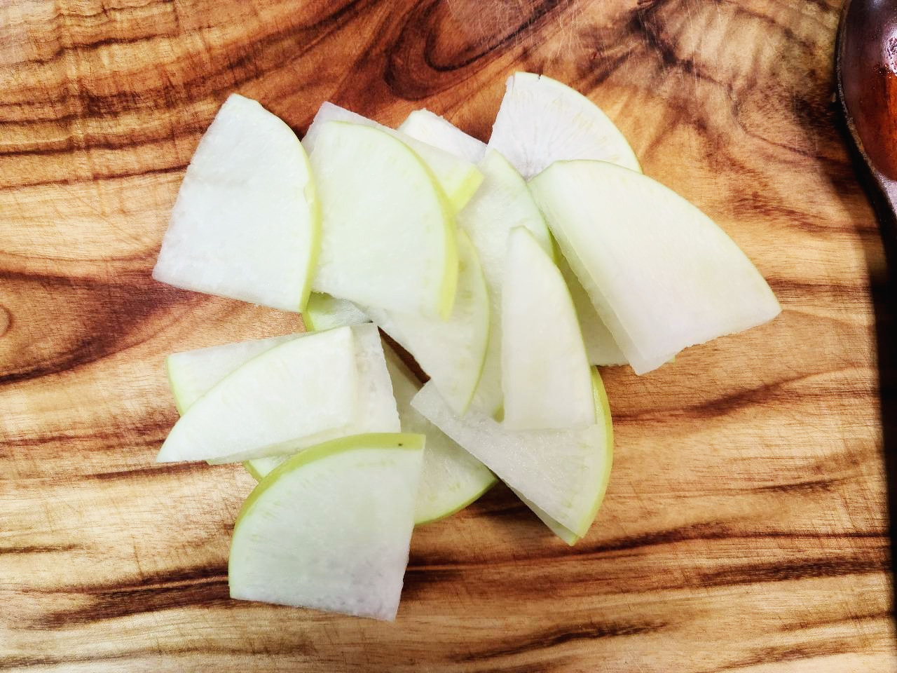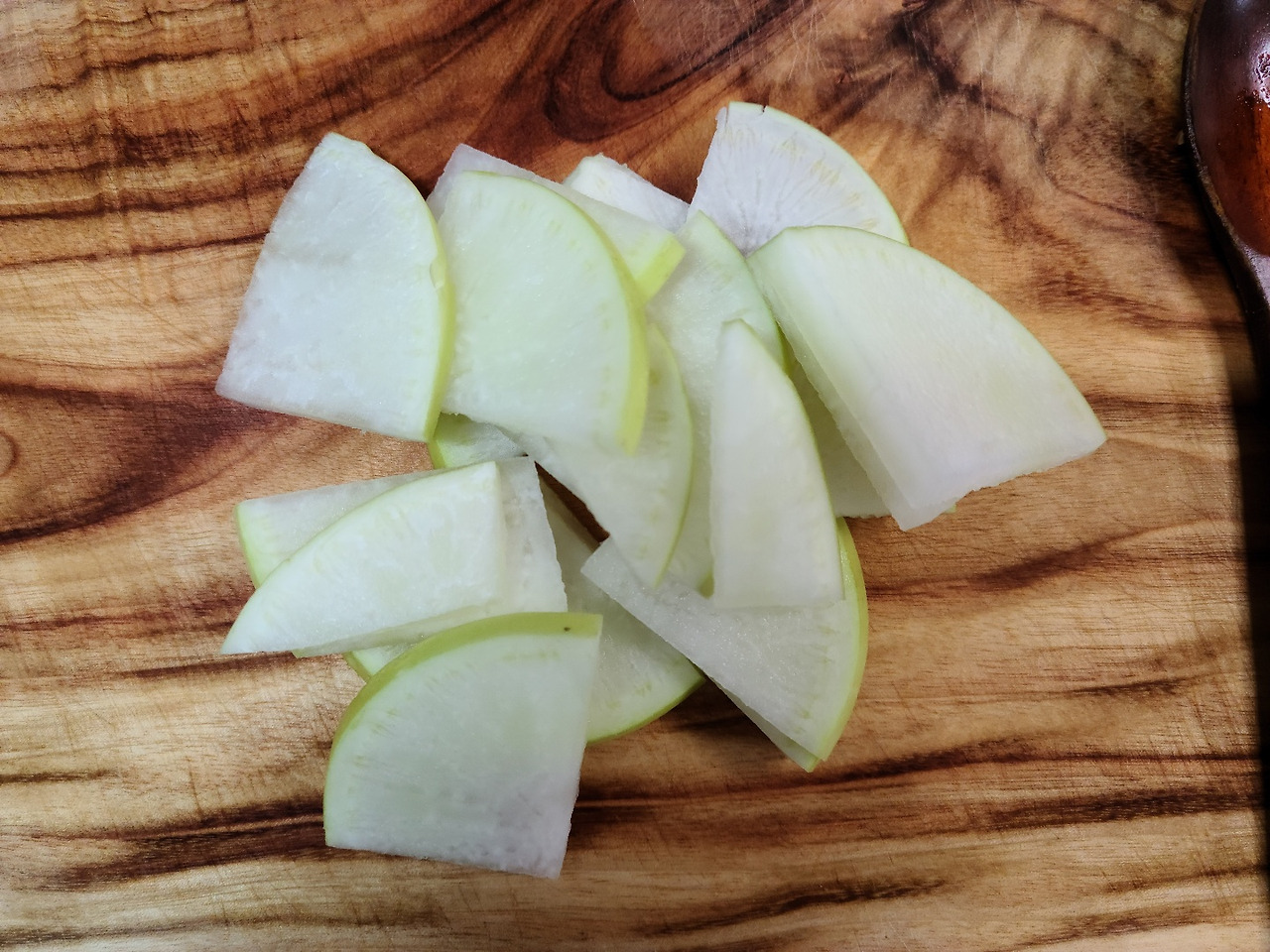 (애호박은 쉽게 무르기 때문에 0.7cm 두께로 썰어서 씹는 맛을 살려줍니다.)