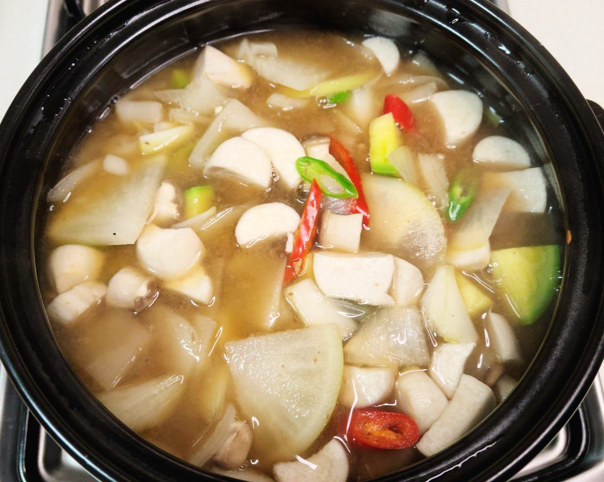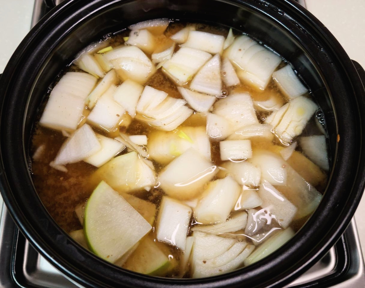 무의 표면이 조금 투명해지면 양파를 썰어서 넣어 줍니다.