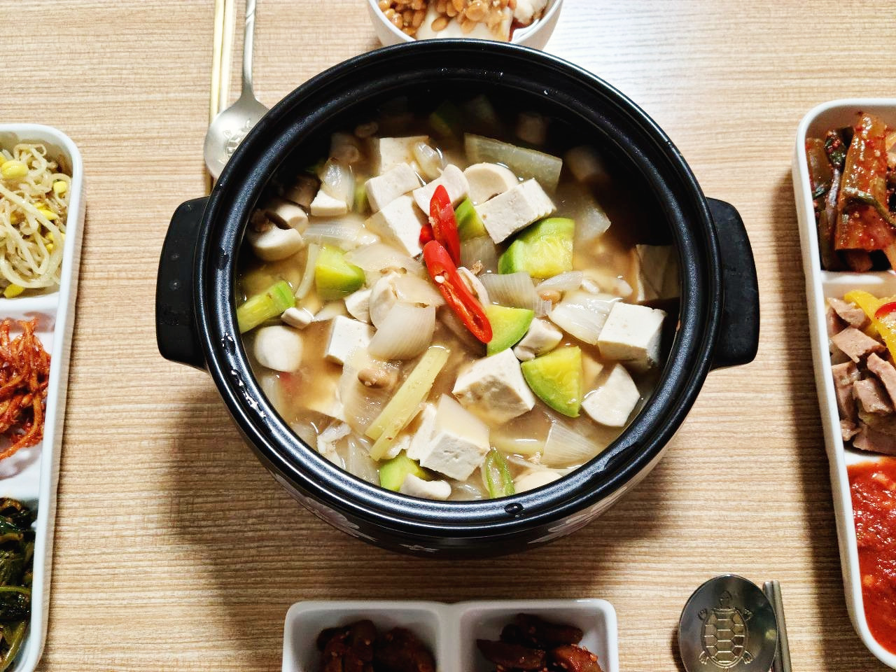 애호박, 양파, 무의 자연스런 단맛과 시원한 맛, 담백한 맛이 청국장의 구수함을 더 맛있게 만들어줬어요. 청고추, 청양고추의 매콤함도 깔끔한 국물과 잘 어울렸답니다.