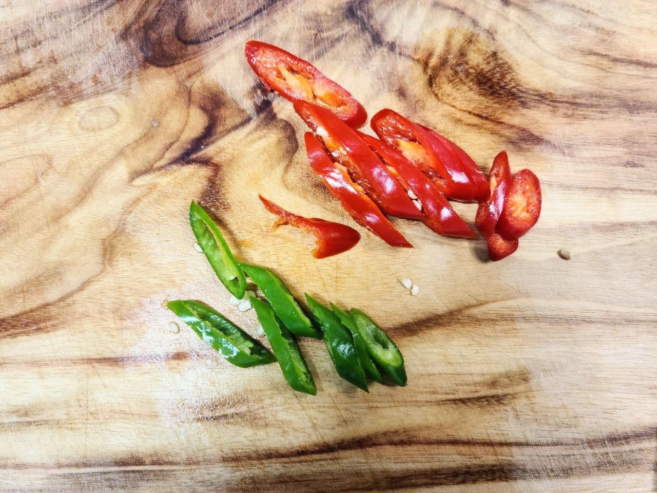 홍고추, 청양고추를 1/2개씩 썰어 넣어 준 뒤