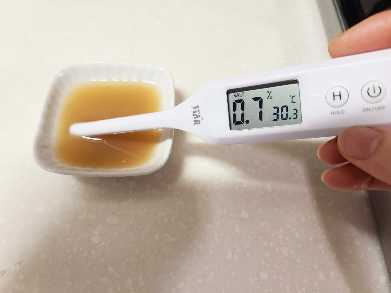 찌개를 조금 덜어서 염도를 측정해 보니 0.7%가 나왔어요.