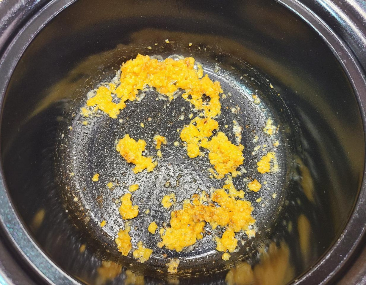 잘 달궈진 냄비에 들기름 1T를 넣고 마늘을 볶아주세요.