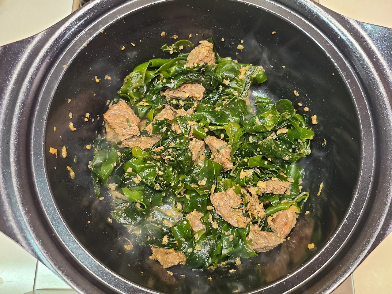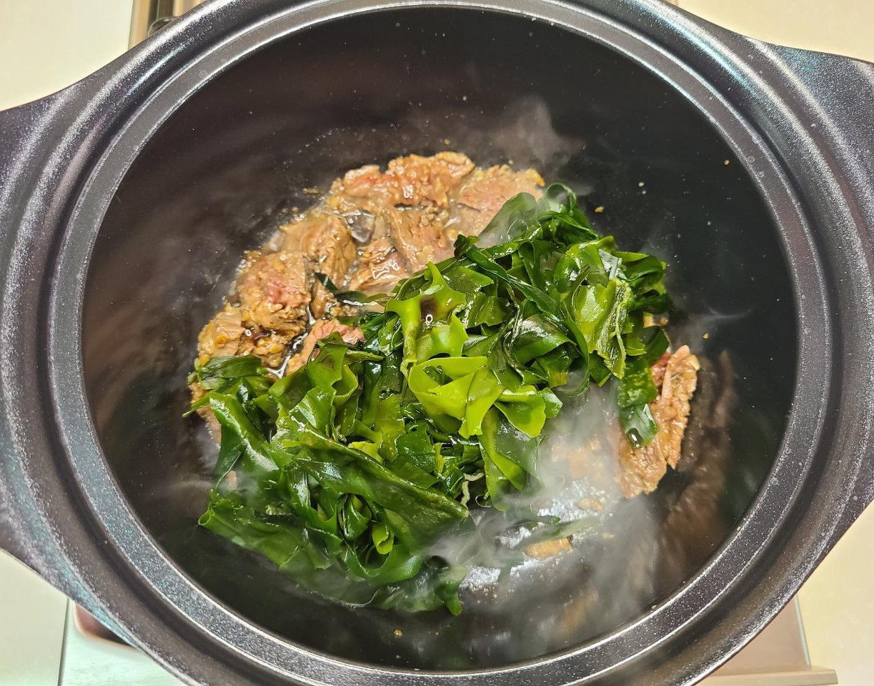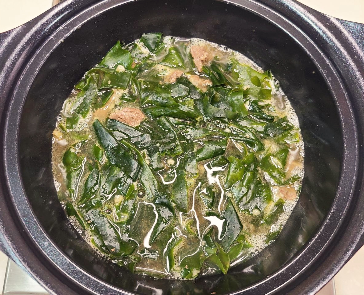 미역이 부드러워지면 물을 넣고 팔팔 끓여줍니다.