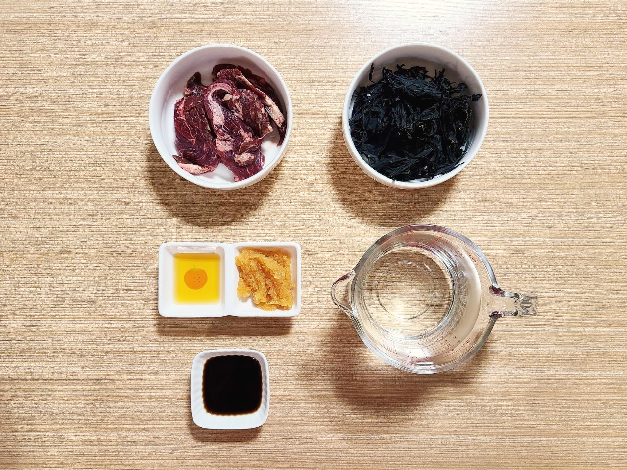 오늘은 물 1L에 국간장 1.5T로 간을 해서 심심하게 '저염' 미역국을 끓여 볼거예요. 심심한 맛을 보완하기 위해 마늘 2T를 넣어 풍미를 살리고 고소한 들기름으로 달달 볶아 소고기 잡내까지 확 날려줄겁니다.