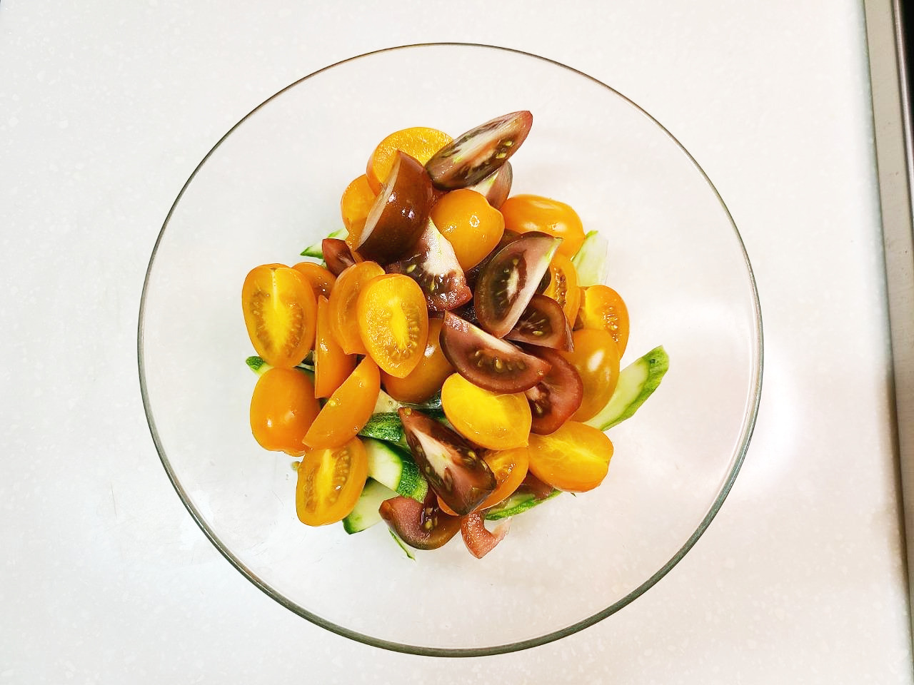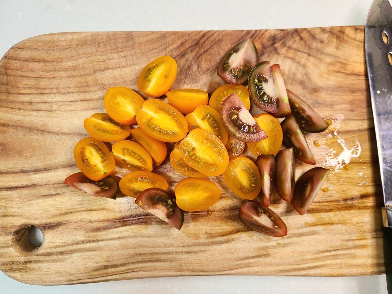 (저는 노란색방울토마토, 미니흑토마토를 사용했어요. 다양한 색의 토마토를 사용하시면 보기에도 예쁘고 영양소도 골고루 섭취할 수 있답니다.)